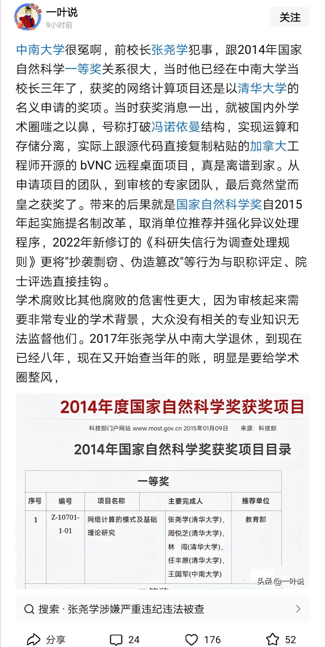 中国工程院院士、中南大学原校长张尧学涉嫌严重违纪违法,不少人旧事重提,谈到其当年获得国家自然科学奖一等奖引发的争议,认为涉嫌违法违纪可能与此有关。如果国家自然科学奖一等奖授奖存在问题,就要严肃撤销授奖,并追究所有参与运作报奖者的责任。跑奖、要奖,也是国家有关部门反复重申要严肃治理的学术乱象。