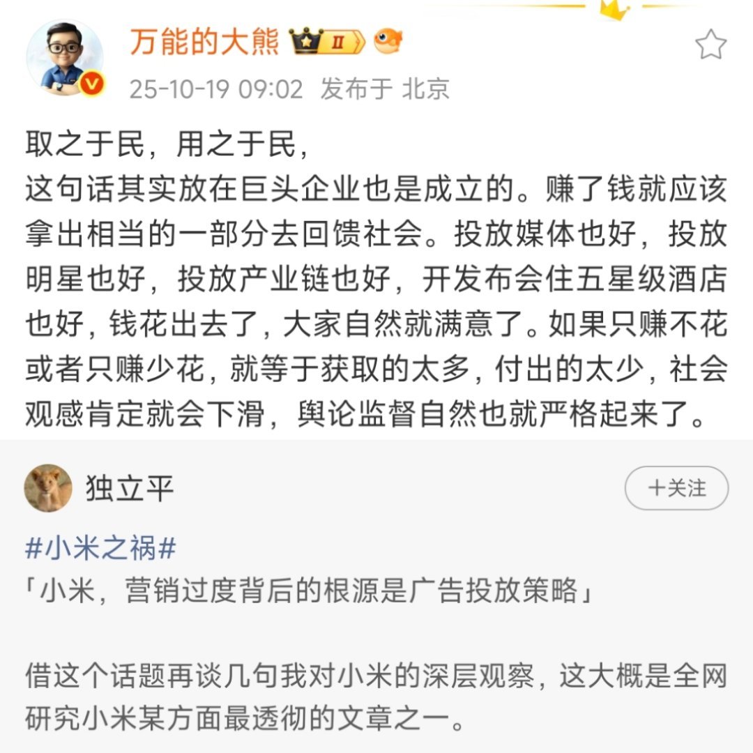 [二哈][二哈][二哈]雷军给武大捐了十三亿,小米产业基金投资几百家企业,小米承诺硬件综合利润不超过5%,小米奖学金助学金一大堆,只是没给无良媒体投入而已,就成了获取的太多,付出的太少。[挖鼻][挖鼻][挖鼻]黑媒体观感不代表社会,大家为好产品买单,不愿意为性能差外观差使用体验差的产品买单,不愿意为次品迭代的车买单,更不愿意厂商攫取高额利润养无良媒体。