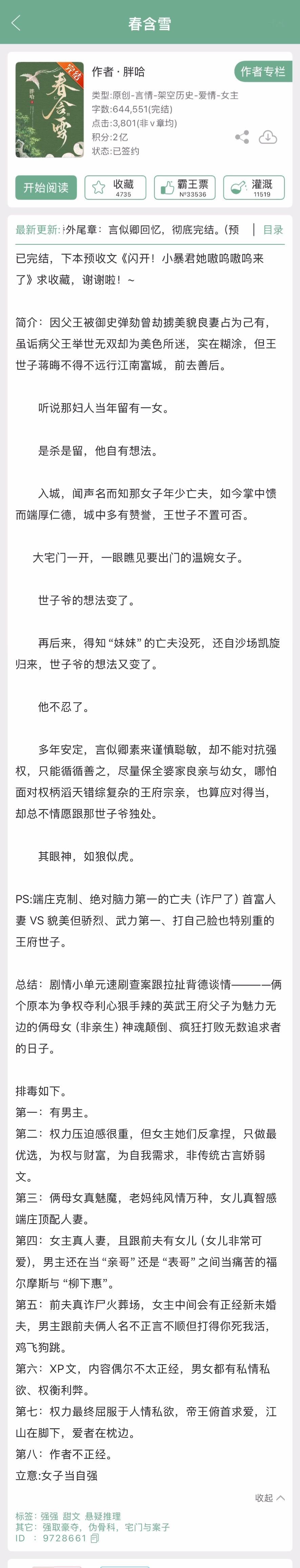 胖哈的《春含雪》完结啦!古言,小单元悬疑探案文,端庄克制、绝对脑力第一的亡夫首富人妻x貌美但骄烈、武力第一、打自己脸也特别重的王府世子[开学季]