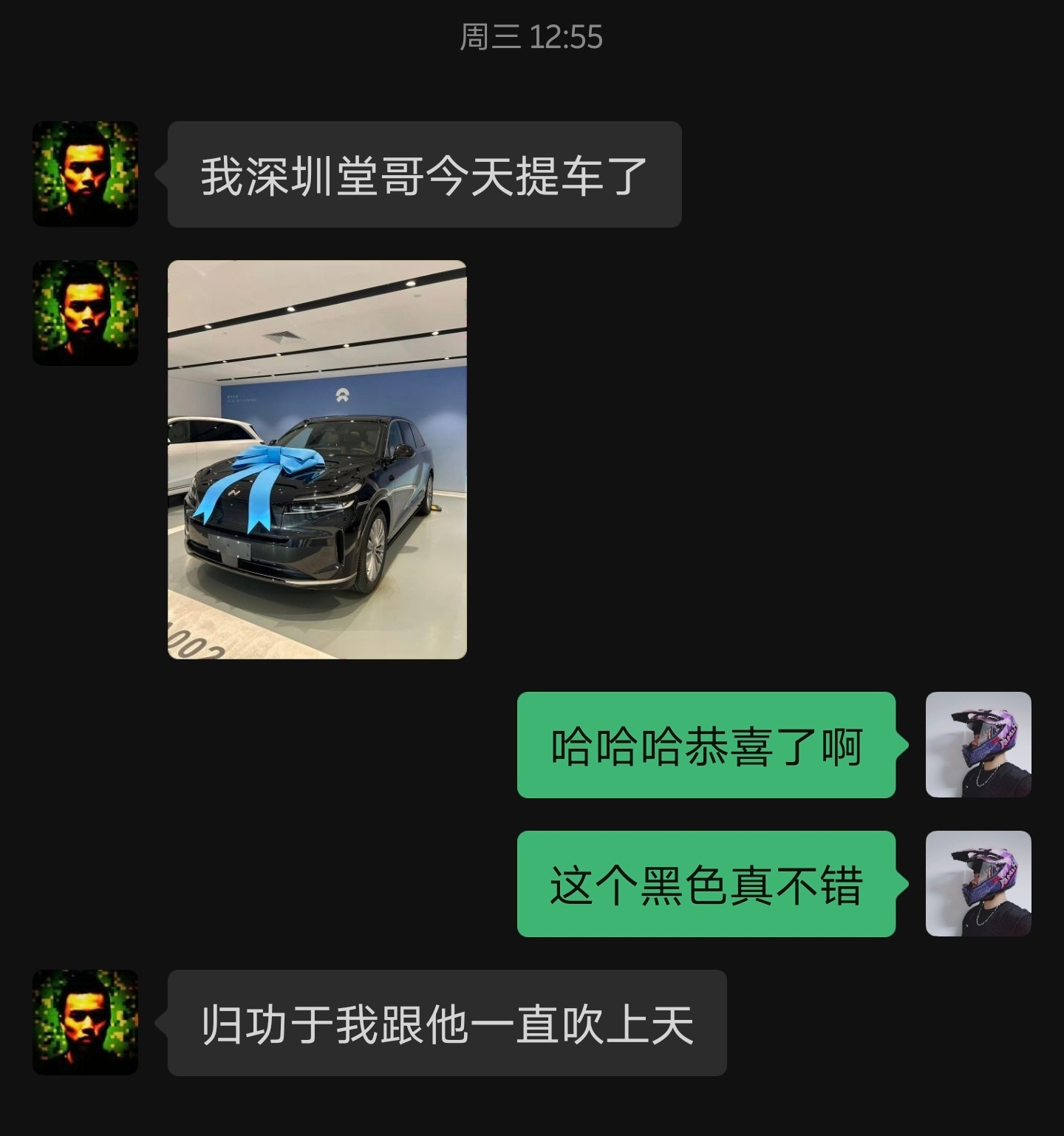 我算出了三份力,自己买了一台L90和一台L60,还有一台L60我逼着我死党(理想L8车主)买的,现在他已经摇身一变“蔚吹”,也成功卖出不少L90了(图二 图三)。期待乐道更多大作,我来继续掏腰包支持[嘻嘻]!