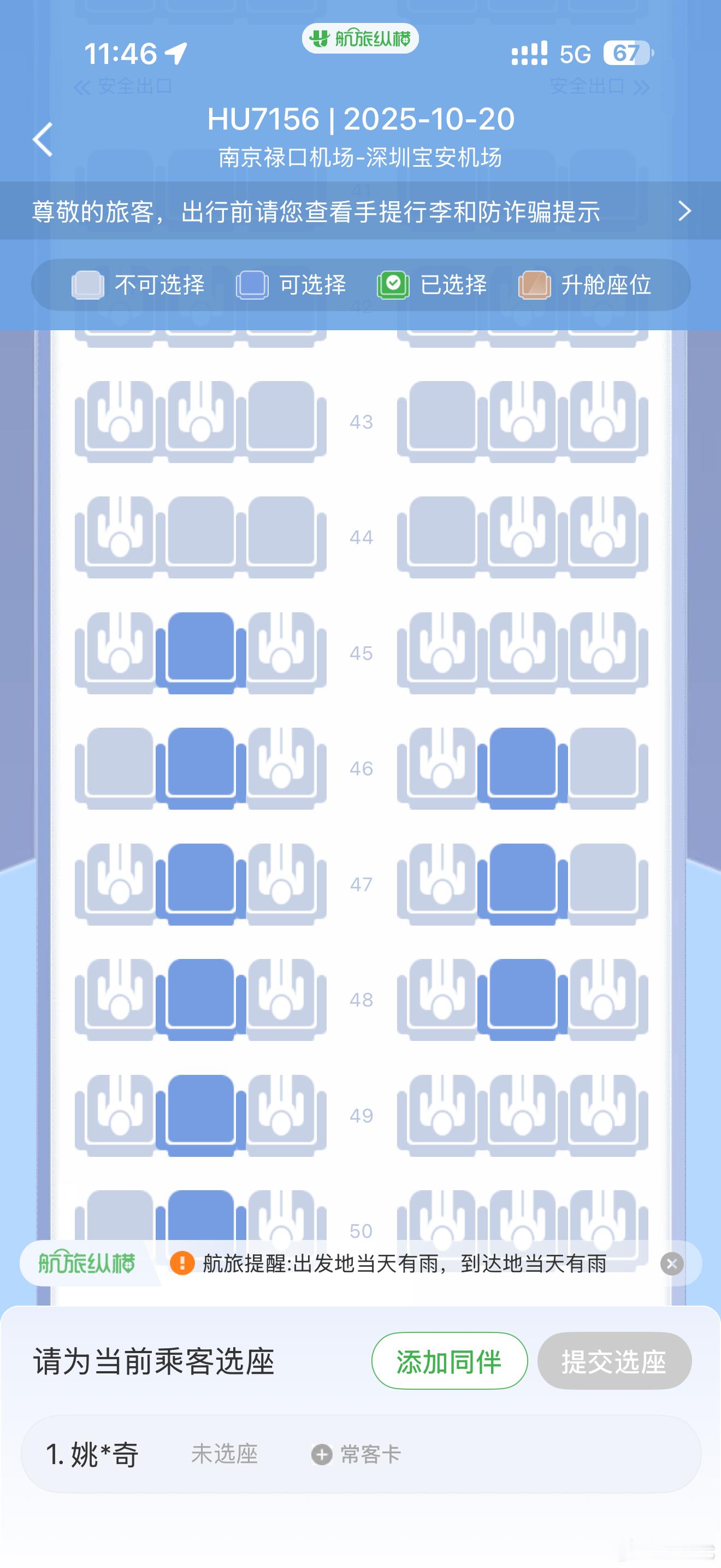 第一次飞海南航空,太秀了,用航旅纵横值机只能值中间座位[裂开][允悲]