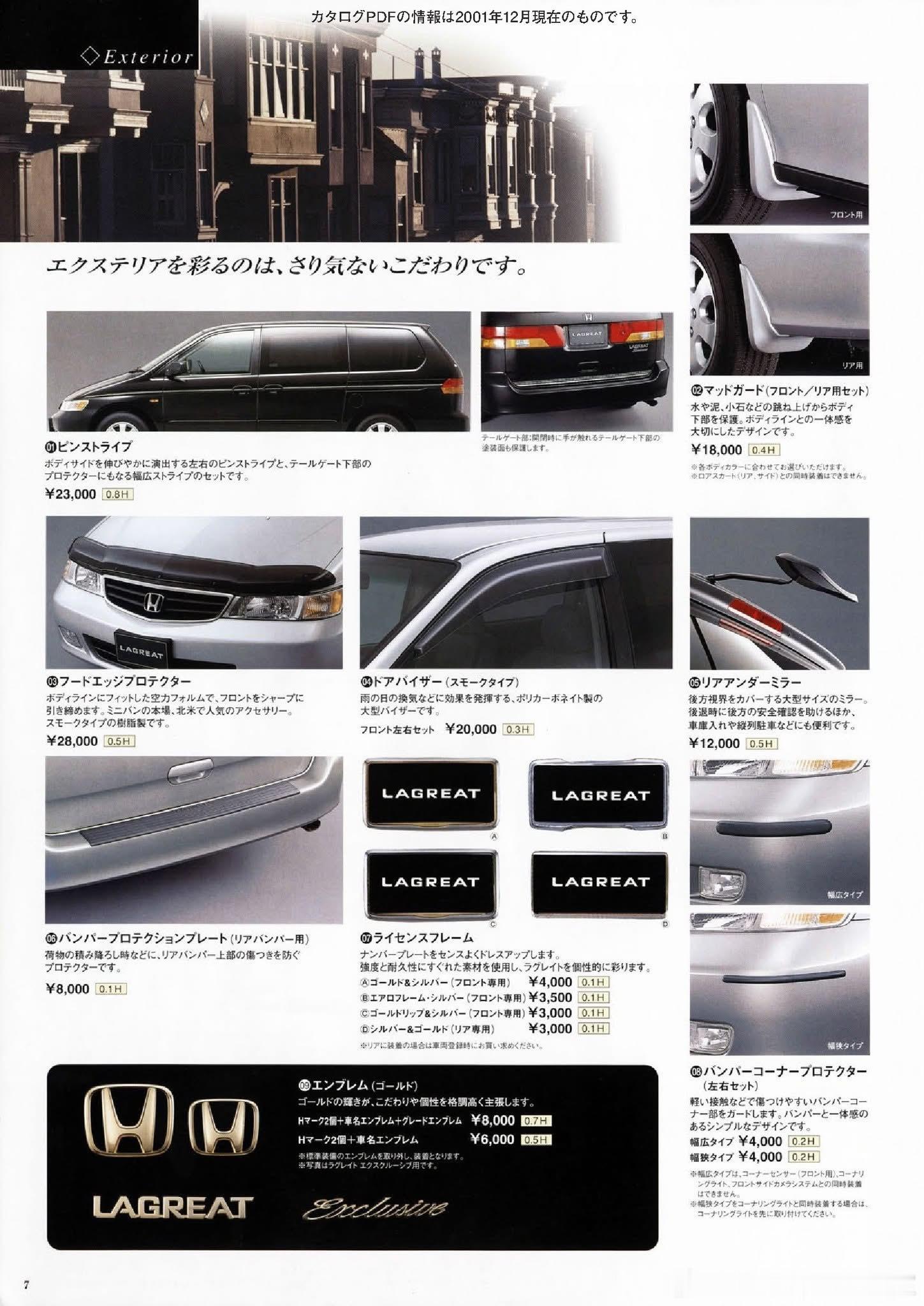 1999年-2004年间的本田美规奥德赛LaGreat,是本田针对日本市场推出的一款MPV车型,它基于第二代北美版奥德赛打造,LaGreat在1999年被推出,定位高于当时日本市场上的日规奥德赛,主打豪华中型客车市场,被本田宣传为一款适合全家使用的车型,兼具实用性和可靠性。该车在加拿大安大略省的阿利斯顿工厂生产,其车身尺寸较大,在当时的日本市场属于较大型的MPV,最初搭载3.5L V6发动机,最大功率为210马力,后期升级到240马力。1999年-2001年款匹配4速自动变速箱,2002年-2004年款则升级为5速自动变速箱。它是日本市场上首款配备导航系统和后排DVD娱乐系统的客车。尽管LaGreat有诸多优势,但由于其价格较高,且车身较大在日本城市中停车不太方便,同时燃油经济性相比竞争对手较差,所以未能达到本田预期的销售成绩。2005年,LaGreat停产,其后续车型为艾力绅(Elysion),该车继续在日本市场延续了本田在高端MPV领域的布局。