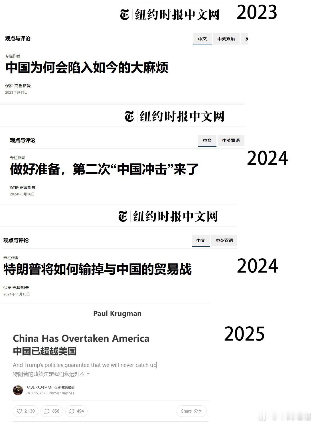美国诺贝奖获得者保罗·克鲁格曼于不同年份在各大媒体上发表对于中国经济的文章
