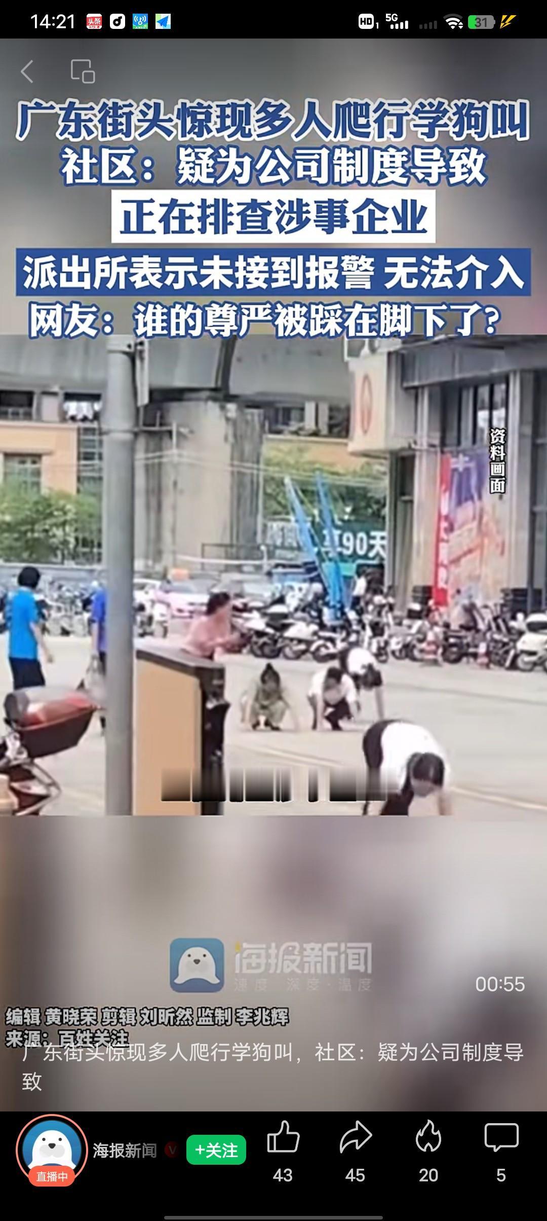 怪事年年有,今年特别多,广州惠州街头惊现多名男女在街上爬行还要学狗叫。 10月17号当地淡水街道,司前社区回应称,他们通过各部门调查核实,这是一教育公司组织的员工突破自我的团建活动。社区已提醒该公司,今后应注意活动方式。 我就纳闷了,教育公司就是这样教育人的?教书育人首先就要尊重人格 ,这样的活动方式明显就是侮辱人嘛,就这样的公司还教育别人,自己公司的员工都搞成这样。业绩管理方式都要有适合适当的管理方式才行,让人在街头爬行学狗叫,你们的目的是什么?你们用这样的方式想要表达什么?真不知道是哪个不着调的提议这样的活动的,也不知道是哪个没脑子的审核通过的,真的是一群缺心眼的,气死我了,公司有这样的领导迟早要黄!