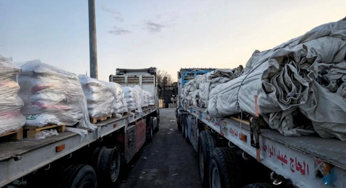 图1:以色列和哈马斯在加沙地带停火期间,满载人道援助物资的卡车在埃及一侧拉法边境的加沙地带过境点排成长队。 (路透)