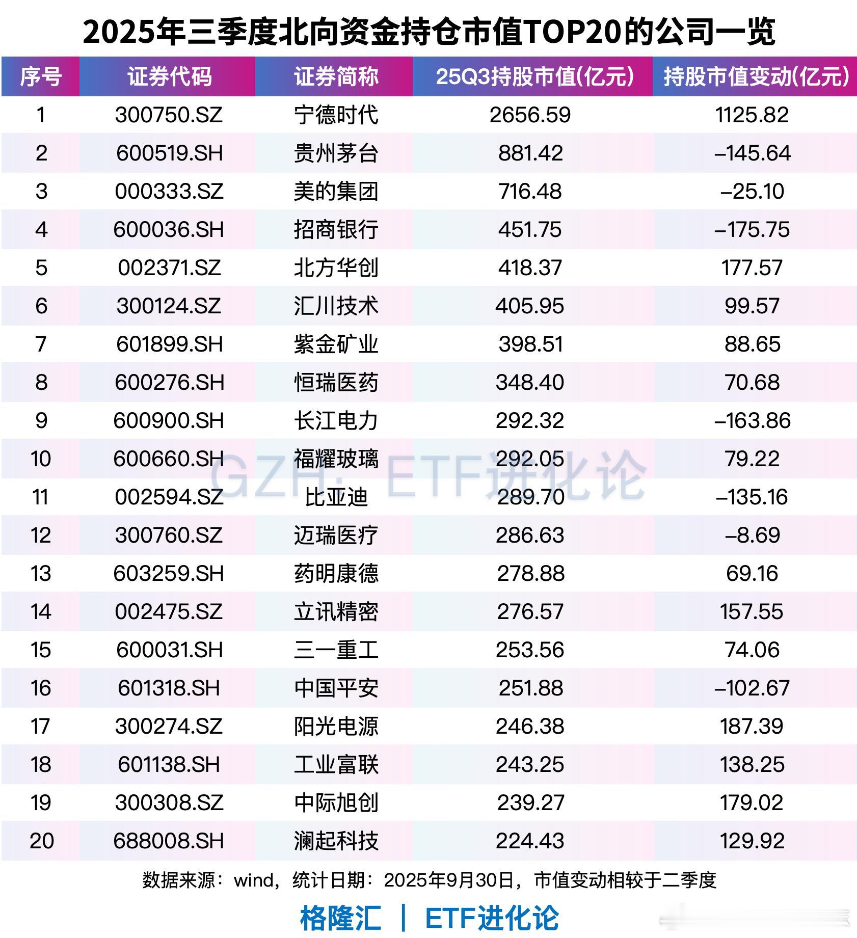 价值投资日志[超话]个股方面,截至三季度末,北向资金前十大重仓股分别为宁德时代