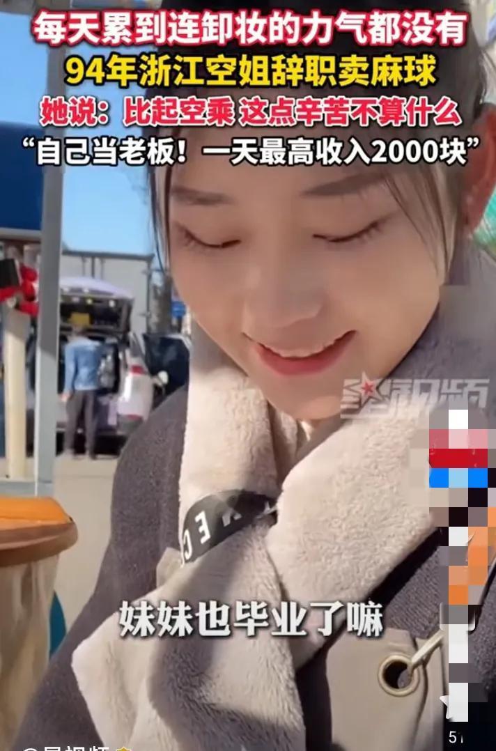 94年空姐辞职卖麻球:别被“光鲜”绑架人生! 谁说空乘的终点只能是蓝天?94年空姐辞职卖麻球的事,戳中了多少困在“体面”里的人!大家总觉得穿制服、飞各地很风光,可只有自己知道,日夜颠倒的作息、重复机械的服务,早把热情磨没了。 她敢跳出舒适圈,不是脑子一热。比起按点打卡看领导脸色,自己炸麻球虽然累,赚多赚少都是自己的,这种踏实感比“空姐”的头衔实在多了。 很多人不敢辞职,无非是怕丢了别人眼里的“好工作”,可日子是过给自己的,光鲜的标签哪有顺心重要? 你身边有没有放弃“铁饭碗”去闯的人?他们现在过得怎么样?来评论区聊聊~