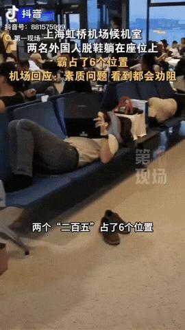 上海虹桥机场候机室,2名外国人直接占了6个位置,他们直接脱鞋躺在座位上,而好心人