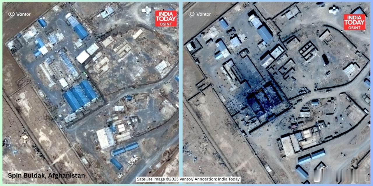 巴基斯坦空军在巴阿冲突中使用精确制导重磅炸弹轰炸阿富汗“阿斯马特-乌拉-卡拉尔”营地的效果对比卫图。此营地是塔利班军队最大的营地之一。