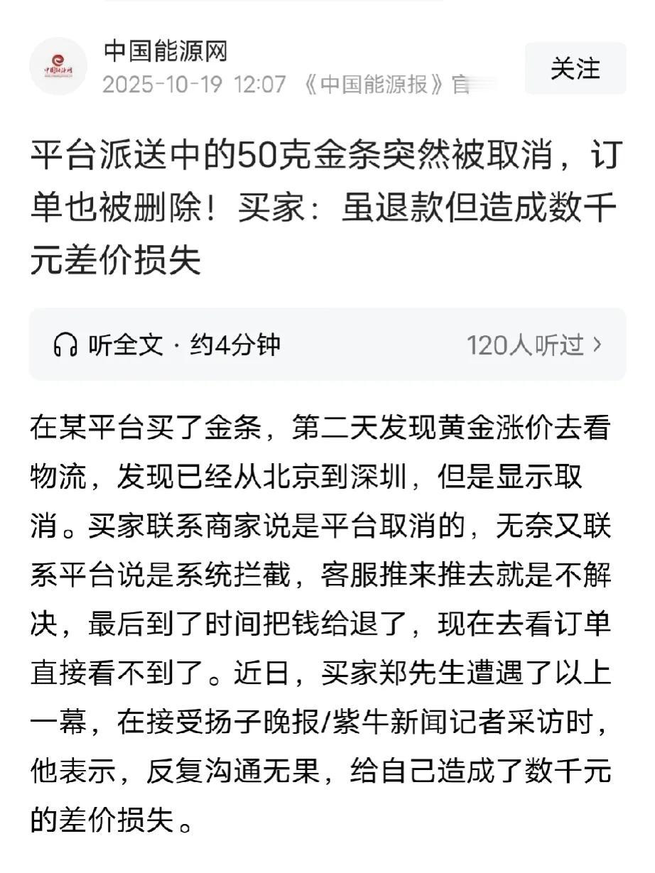深圳,男子在某平台花了45015元买了50克金条,谁料,刚下完单,金价突然上涨,男子乐坏了,赶紧转手高价卖出,没想到,次日订单显示“派送中”时又改成“已取消”,男子赶紧联系商家,商家表示他们没权限取消,男子又联系平台,客服表示他的订单被系统拦截了。商家和平台相互踢皮球推卸责任,男子气不过,发到网上,结局让他闹心。 10月10日,郑先生在某平台旗舰店下单买了一块金条,金条重达50克,当时的金价是900.3元一克花了他45015元。 谁料,郑先生刚下完单不久,意外发现金价涨了,这可把他乐坏了,短短几分钟时间轻轻松松就让他赚了几千块钱,简直不要太爽。 郑先生担心金价会有波动,而且这块金条他一时半会也用不上,他心想着。倒不如先把它给卖了,钱落袋为安。 所以,他转身就联系了买家,把金条转手卖出去了。 买家是深圳人,郑先生为了省去邮费和中间的麻烦,他在跟买家确认后赶紧把收货地址从北京改到深圳。 次日早上,郑先生发现物流信息已经更改为从北京到深圳。 没想到,就在他以为很快就能收到金条的时候,却发生了意外。 10月11日下午,郑先生查看订单时,订单首先显示正在派送中,过了一会儿,郑先生再次查看订单,发现已经取消了。 郑先生懵了,物流显示不是派送中吗,怎么突然取消了呢? 为了弄清楚到底怎么回事,郑先生立即联系商家,商家回复他说,自己是商家,没有权限取消。 郑先生又找到平台,平台客服说,郑先生的订单被系统拦截了。 系统会结合下单记录、收货地址、账号信息和购物历史来判断订单。 要是买的东西数量远超平时过日子的需求,影响到其他普通买家了,订单就可能被系统拦下来或者取消。 客服建议,郑先生换个时间,或者用别的账号再试试。 郑先生说自己是正常下单买东西,就是下单后把收货地址从北京改成深圳了,并不存在影响其他普通用户的利益。 接下来的几天,郑先生为了恢复订单,尽快给自己的买家发货,他从10月11号到13号多次联系客服要求恢复订单,解决配送问题。 但是,客服多次表示会有专人跟进,请郑先生耐心等待。 可郑先生等了几天,问题依然得不到解决,商家和客服一直相互踢皮球,更让他气愤的是,等了几天等不到他们给自己解决问题,还把已经取消的订单给彻底删除了。 如果不是郑先生提前截屏留下证据,这个订单就好像没发生过一样。 10月14日,因超时原因,45015元钱退到郑先生的账户上。 之后,平台联系郑先生,表示他们愿意给郑先生200元补偿。 郑先生没有接受,他提出了2千元的补偿,但是,客服不同意,双方谈不拢,郑先生联系媒体曝光。 记者联系了客服,但是对方表示,只愿意跟郑先生联系,其他人拒绝沟通。 最后,郑先生不得不在别的金店以940元一克的金价,买回后,再发货给他的买家。 事后,郑先生把这个事发到网上,有朋友说,他也遇到类似情况,他怀疑是平台和商家联手找钱。 《民法典》第491条规定,当事人一方通过互联网等信息网络发布的商品或者服务信息符合要约条件的,对方选择该商品或者服务并提交订单成功时合同成立,但是当事人另有约定的除外。 本案中,郑先生于今年10月10日在平台下单支付45015元购买金条,提交订单并完成支付时,与商家的买卖合同已依法成立。 平台以“系统拦截”为由单方面取消订单,且未提供“郑先生购买数量远超正常生活需求”的有效证据,商家亦表示无取消权限,该取消行为构成违约。 郑先生因订单取消需以940元/克高价补购金条造成的差价损失,与平台违约行为直接相关。 《消费者权益保护法》第8条规定,消费者享有知悉其购买、使用的商品或者接受的服务的真实情况的权利。 本案中,平台以“系统综合判定”为由取消订单,但未向郑先生明确说明“订单异常”的具体依据,如哪项下单记录、购物历史显示其超出正常需求,亦未提供判定标准的公示信息。 此外,平台在未告知郑先生的情况下删除已取消订单,若未提前截屏将导致订单痕迹灭失,严重剥夺了郑先生知晓交易详情、留存维权证据的权利,涉嫌侵犯其知情权。 《消费者权益保护法》第52条规定,经营者提供商品或者服务,造成消费者财产损害的,应当依照法律规定或者当事人约定承担修理、重作、更换、退货、补足商品数量、退还货款和服务费用或者赔偿损失等民事责任。 本案中,平台单方面取消订单后,仅同意补偿200元,远不足以覆盖郑先生补购金条产生的差价损失(1985元)。 商家与平台相互推诿,前者称无取消权限,后者仅以模糊理由搪塞,未切实解决问题,且存在删除订单的不当行为,应当对郑先生的实际财产损失承担赔偿责任。 付款成交即合同成立,金价上涨就借“系统判定”单方面取消订单,还删记录、踢皮球,既违约又侵权。 200元补偿更是敷衍,完全无视消费者实际损失,暴露了其契约精神的缺失和对消费者权益的漠视。