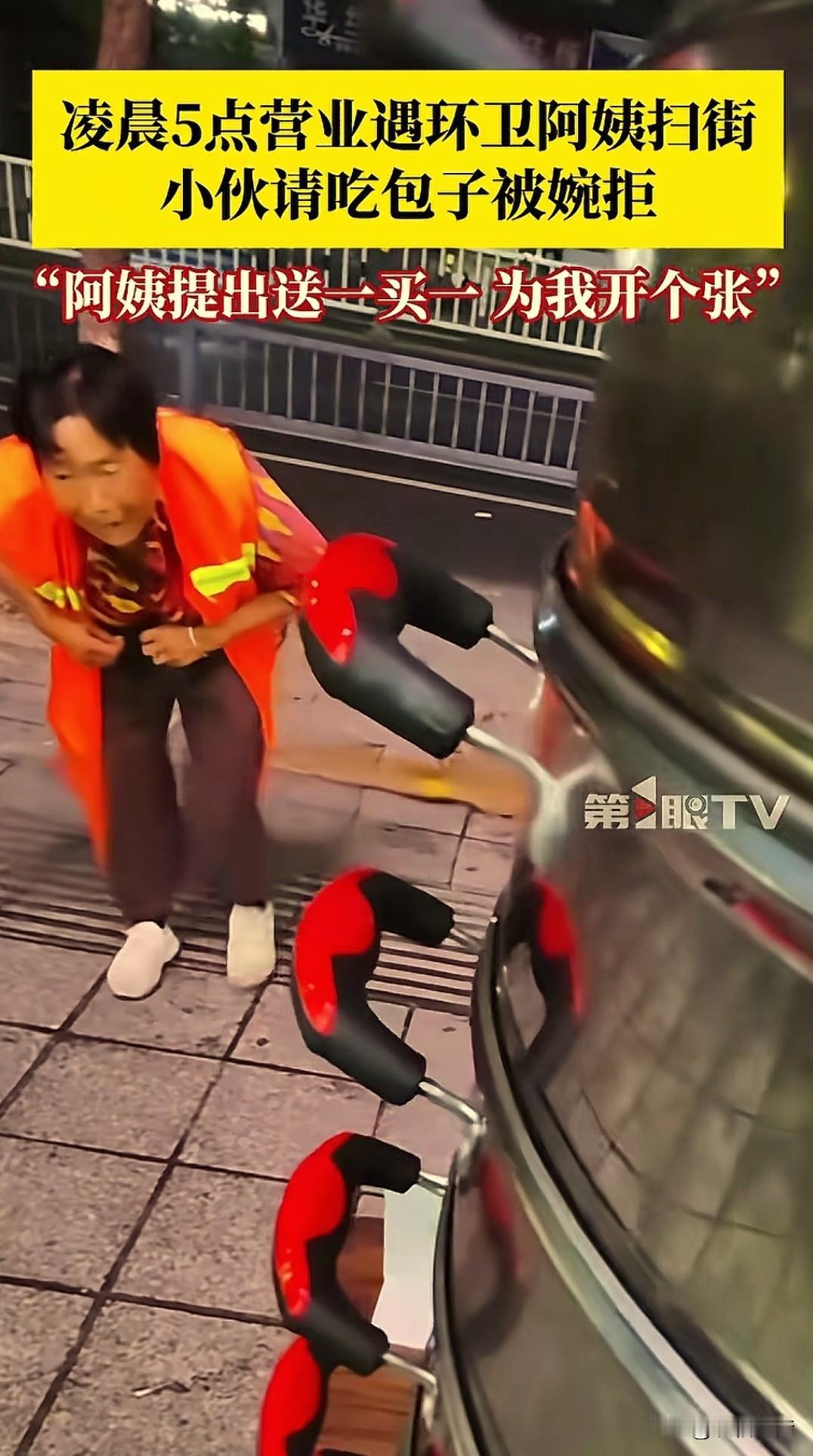 江西九江,一男子凌晨5点出摊卖包子,突然偶遇一名驼背环卫女工在扫大街,男子心里一酸,提出请女工免费尝尝包子。本以为女工会接受,结果女工走过来接过包子只说了一句话,让男子不得不收下早餐钱。 也许男子觉得女工身体有残疾很可怜,可女工却不这么想,从她用自己的双手换取劳动报酬就看得出,她身残志坚,骨子里透着尊严! 根据第 一眼新闻报道,这件相互奔赴的暖心事,就发生在10月18日。 当天清早,是男子头一次出摊卖包子,路上根本没什么人,而男子第 一个遇到的人,就是这位环卫女工。 她佝偻着直不起来的身体,正和男子一样,卖力的干着自己的本职工作。当听说男子免费送她包子时,女工明显一愣,她没拒绝,反而放下手里的工具,走了过来。 一边走,一边从裤兜里掏出钱,男子连连说:“不用你拿钱,免费请你。”说完拿出两个包子递了过去。 结果女工问了价 格后,却说:“你还没开张吧?这样吧,我买一你送一。” 男子瞬间心头一暖,这一次他没在坚持,那一刻,两个人心里都明白,一个是心疼对方身体不方便,一个是觉得摆摊不容易为了养家糊口。 男子看着离开的女工和第 一笔开张的钱,心里感动得不知如何是好,他只知道,今天一定是幸运的一天! 有人说:阿姨是懂做生意的,当天头一单必 须收钱,这是规矩,为阿姨点赞!! 也有人说:她只是工资低,素质可不低! 还有人说:男子也是个善良的人,就冲这格局,生意不会差!