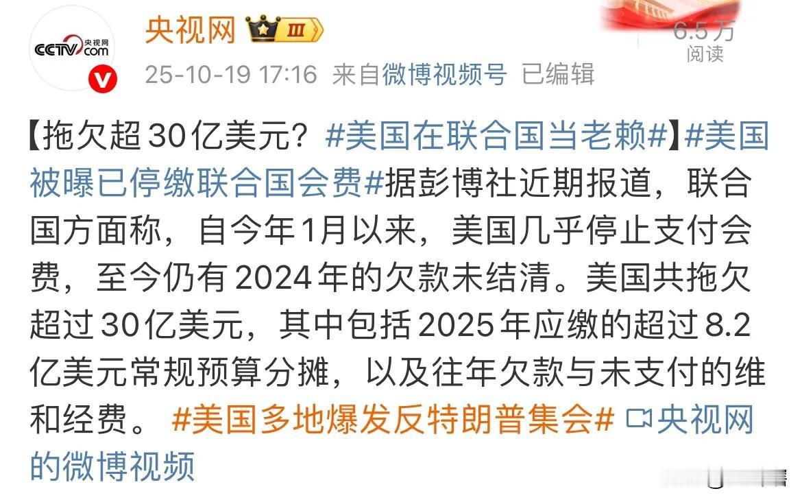 【联合国濒临破产,美国成最大老赖】 综合媒体消息,联合国秘书长古特雷斯近日发出警告,他表示由于联合国会员国没有按时缴纳会费,该机构将面临破产危机。 古特雷斯还提议缩减该机构人员编制,将在2026年减少超过2600个岗位,以此来应对联合国机构所面临的财务危机。 据悉,造成这一局面的最大原因是美国未按时缴纳超过30亿美元的会员欠费,也是该机构最大的老赖。