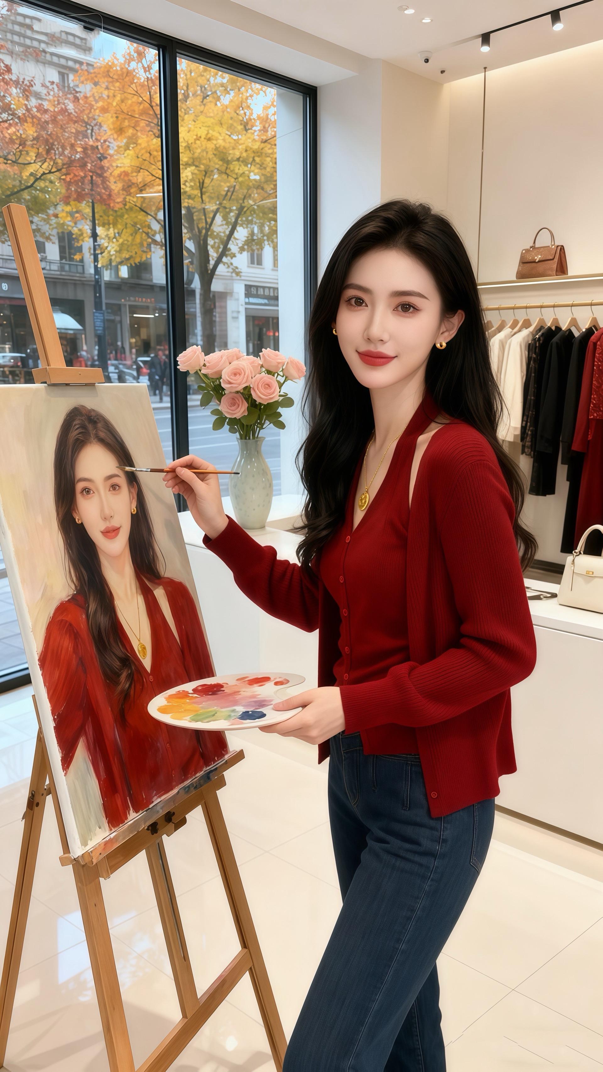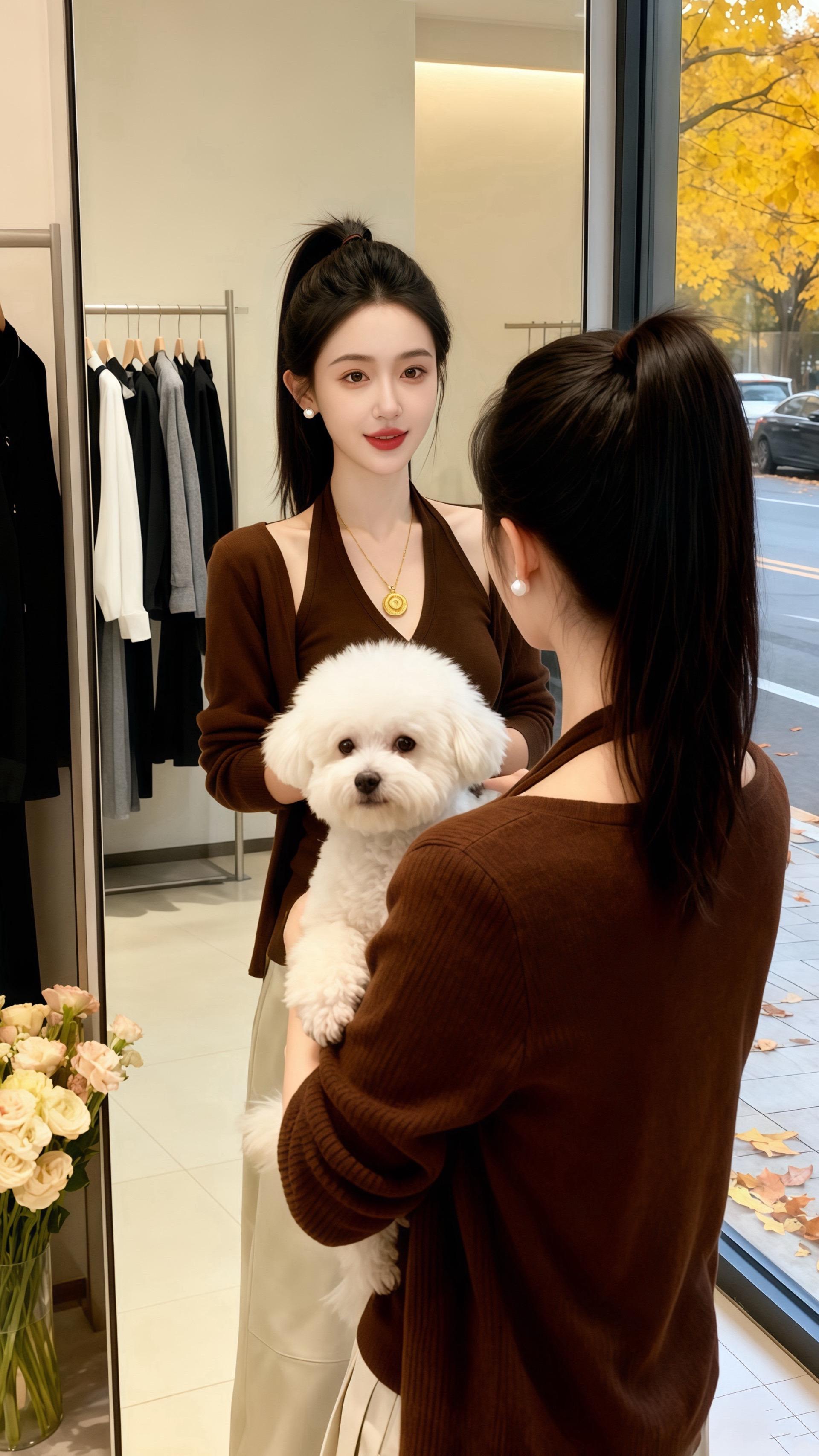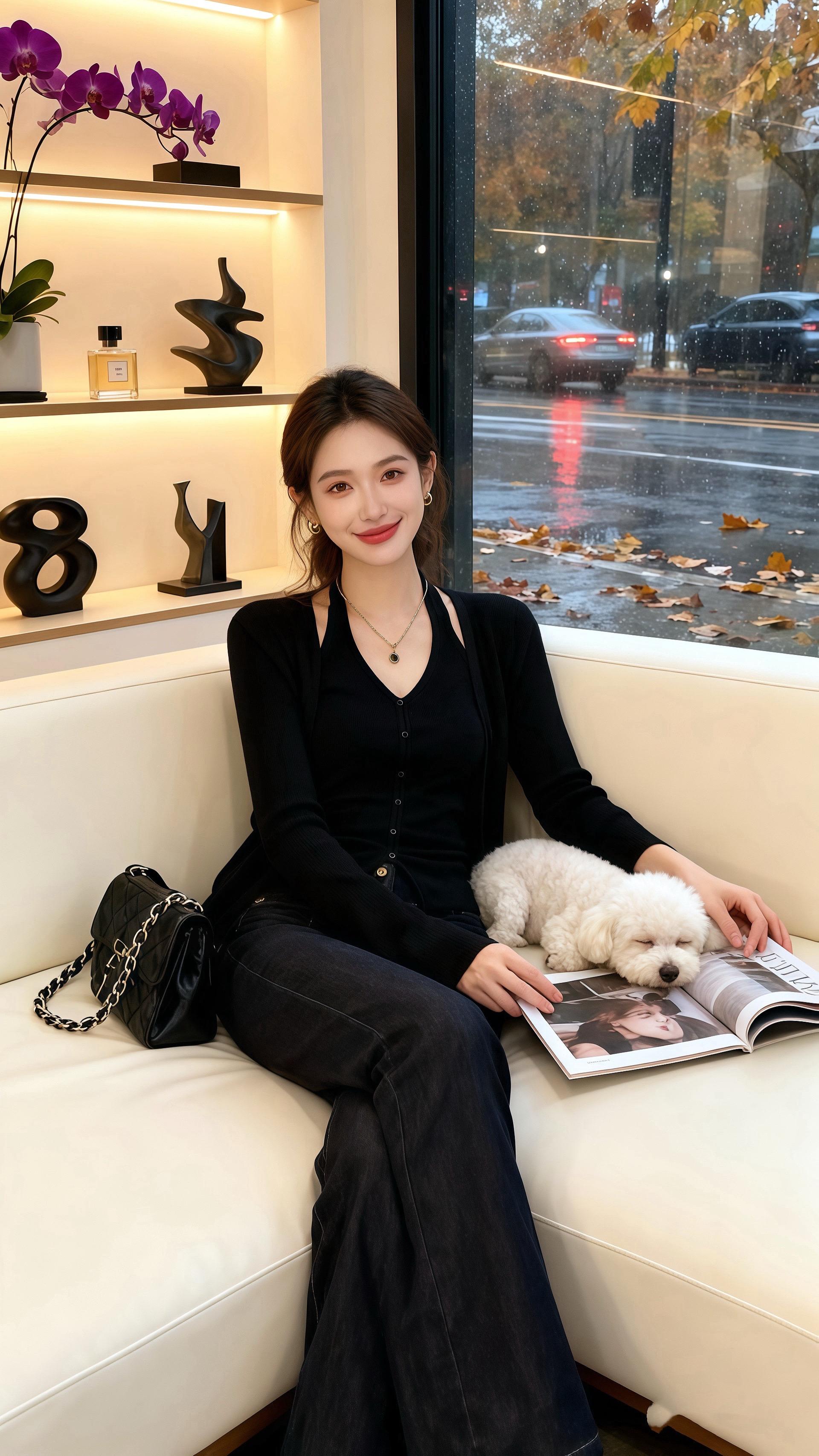 秋雨敲打着橱窗,将街面的金黄落叶晕染成一幅朦胧的画。许妍坐在女装店的米白沙发上,指尖抚过杂志页面,怀里的比熊犬“奶糖”蜷成一团,睡得正香。