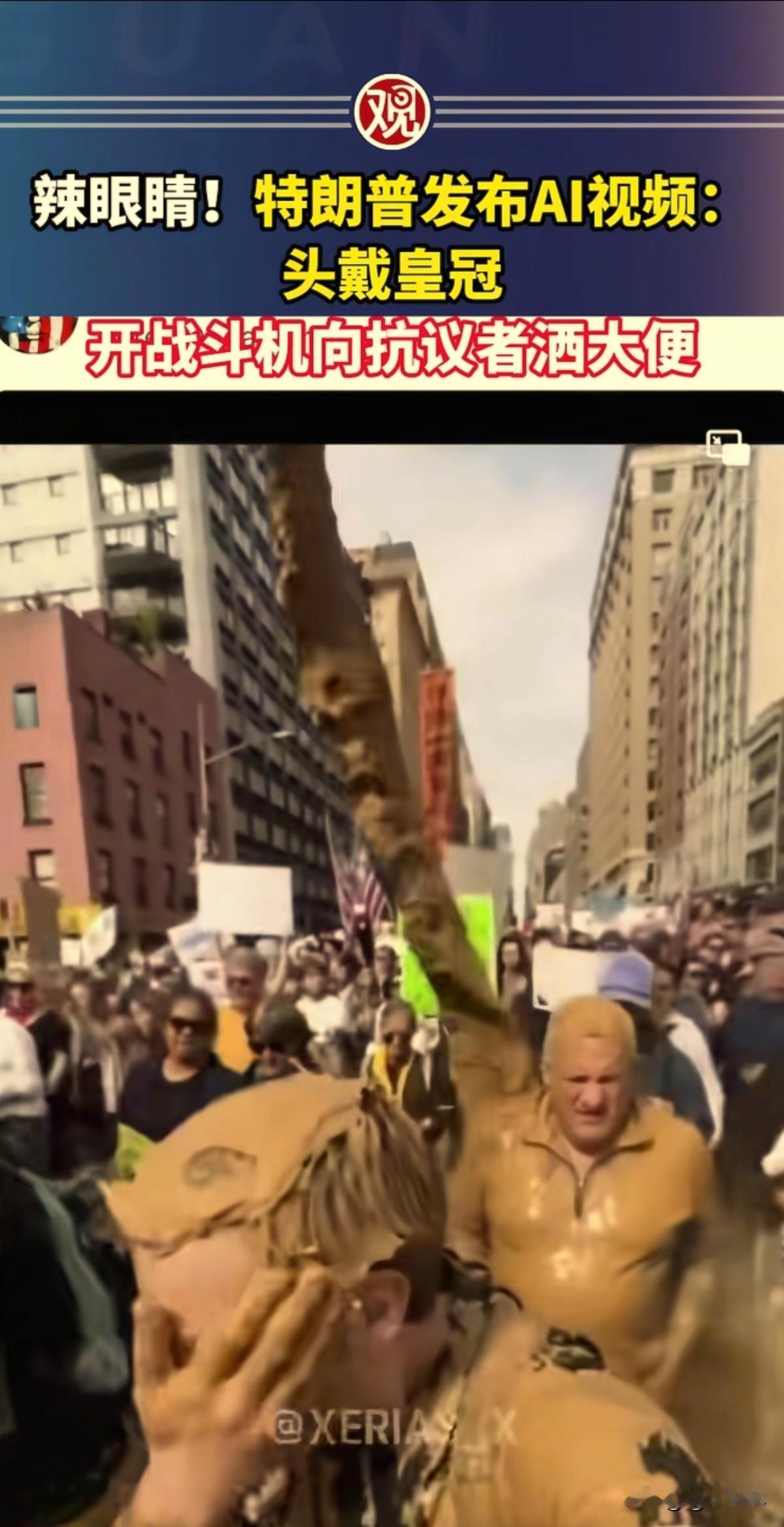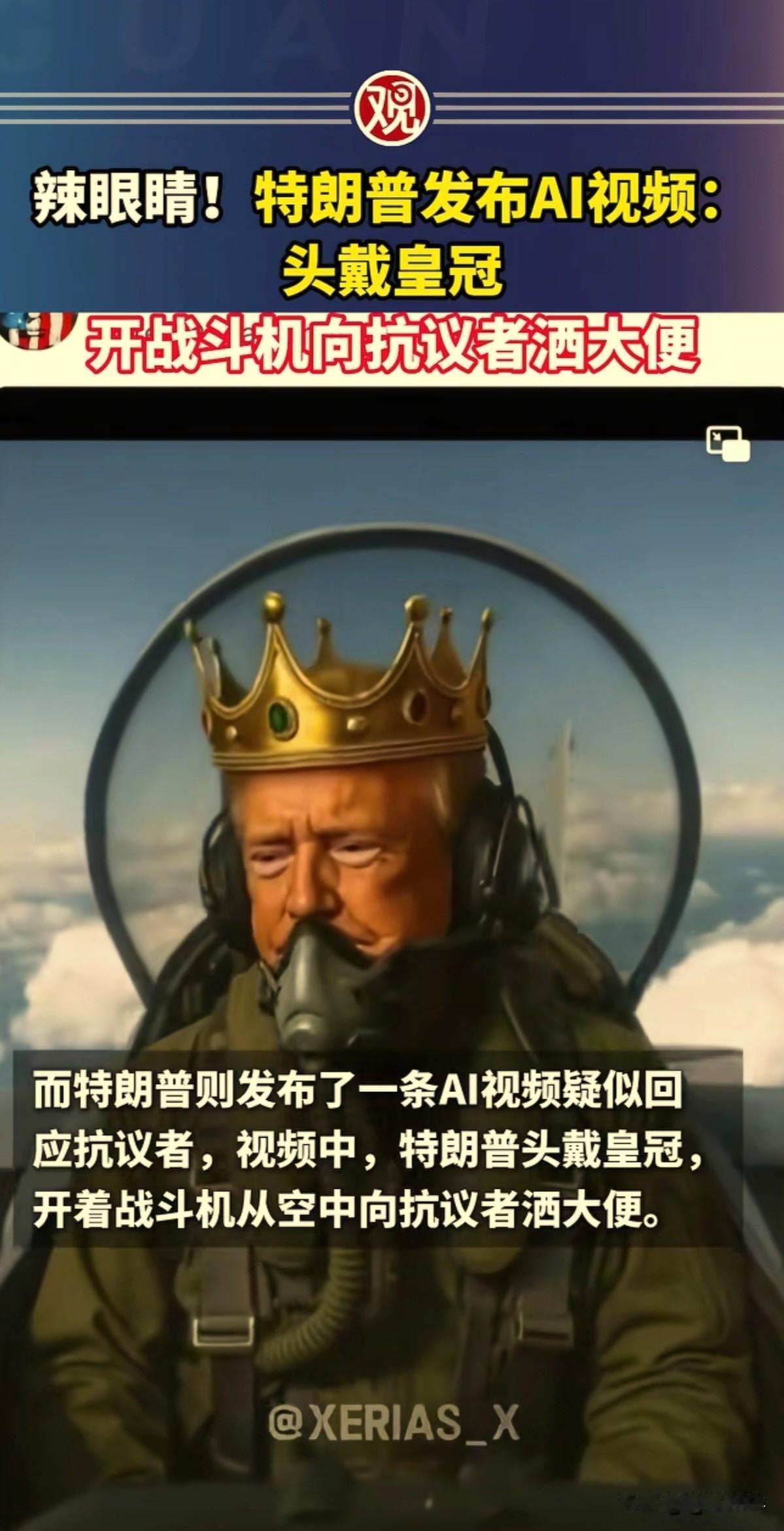 特朗普真是人才,完全是个“joker”!700万人参与“不要国王!”全国性示威,联邦政府停摆19天,连驻华大使馆都要关闭,特朗普还在自己的社交平台发AI讽刺视频搞笑。视频中,特朗普头戴王冠、驾驶战机,向抗议示威的人群“投放大粪”。真的太搞笑,是“苦中作乐”,还是“乐观”呢?美国国内的摊子已经够乱了,还遇上一个特搞笑的总统,真的是无语了!这个号称“世界文明灯塔”的国家,在全世界闹了个笑话!