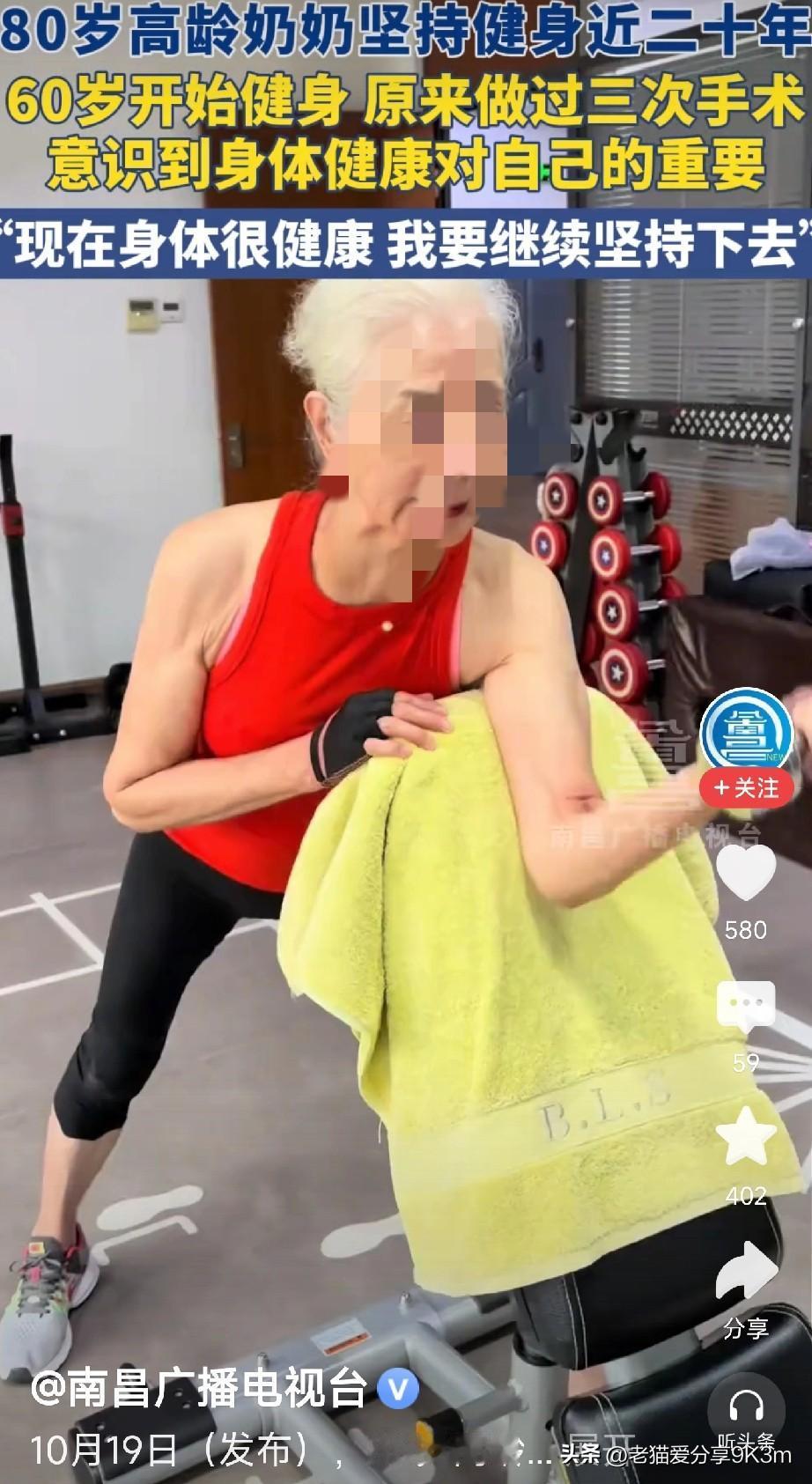 太震撼了! 80岁奶奶活成了我们梦想的样子! 刷到一个视频,一位80岁高龄的奶奶在健身房熟练地做着各种器械训练,精神饱满,动作标准,这状态让年轻人都自愧不如。 原来奶奶60岁才开始健身。之前做过三次手术,让她深刻意识到——健康才是真正的财富。 近二十年坚持,换来的是硬朗的身体和饱满的精神。奶奶说:“现在身体很健康,我要继续坚持下去!” 看到这里,我默默放下了手中的零食。 朋友们,别再找借口了! 60岁开始都不晚,咱们还有什么理由不行动起来? 健康这件事,什么时候开始都不晚,但最好的时机就是现在! 一起动起来吧,为了80岁时的我们,也能这样活力满满! (文章素材来自南昌广播电视台,侵删)