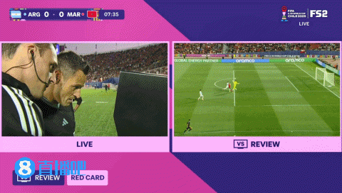 第6分钟,摩洛哥后场长传,扎比里单刀挑射,被出击的阿根廷门将巴比放倒!摩洛哥方面提出挑战!主裁去场边观看VAR,最终没有红牌,向门将巴比出示黄牌,并判罚任意球↓