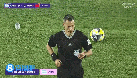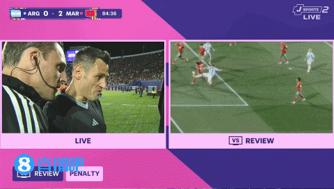 第83分钟,阿根廷投诉摩洛哥禁区内手球,再次提出VAR挑战!主裁判回看录像后,依然没有判罚点球↓