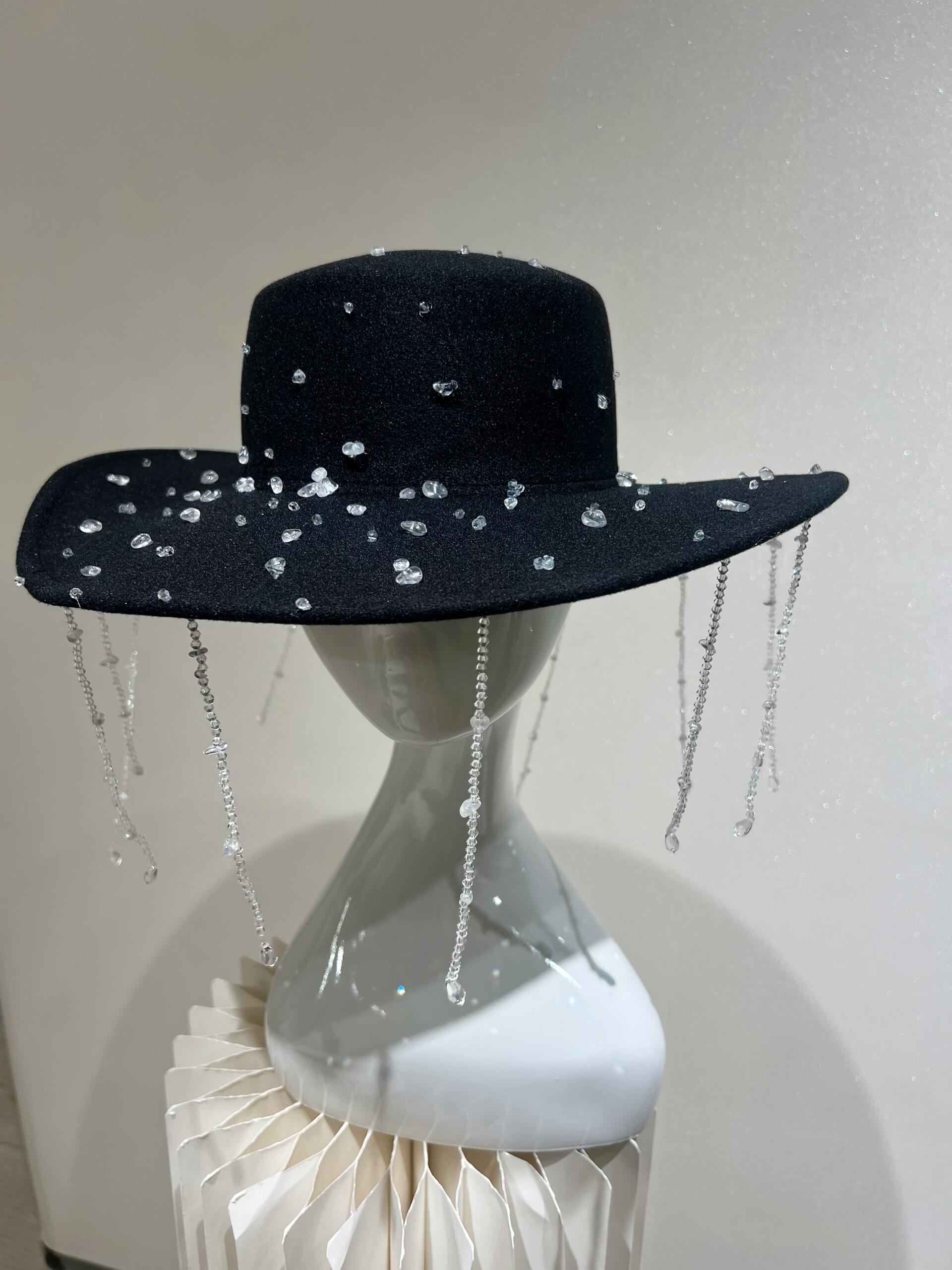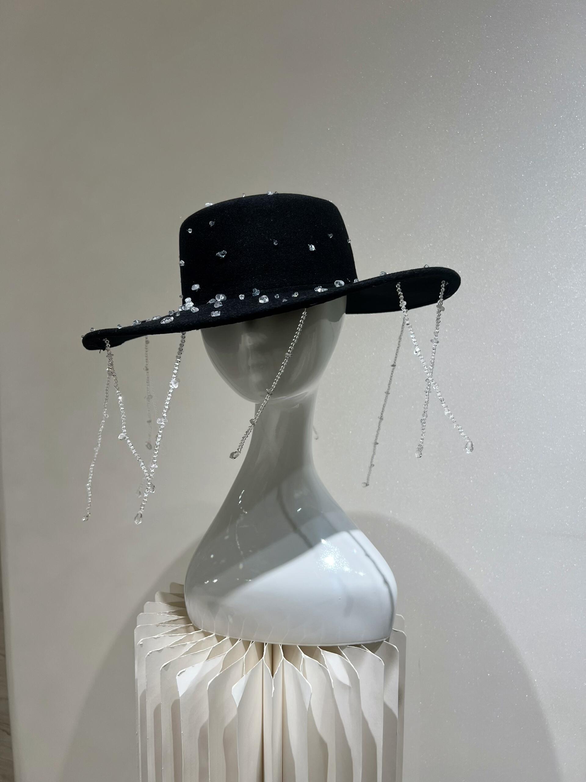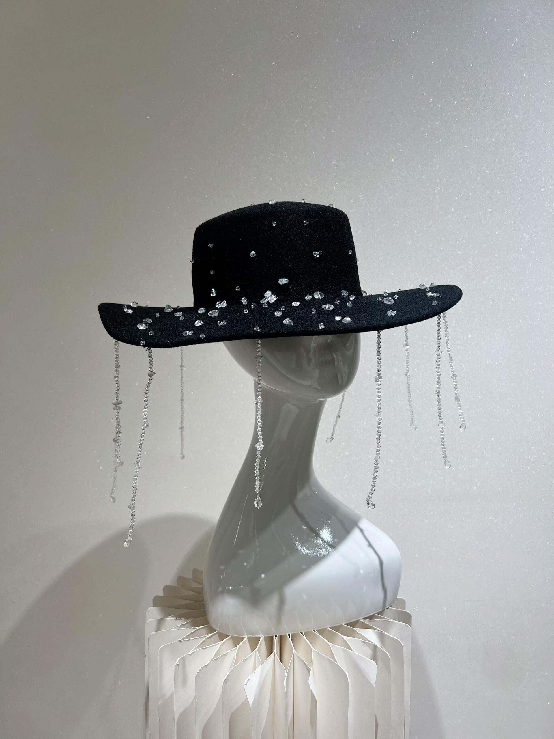 这顶黑色宽檐绒面礼帽,帽身与帽檐缀满闪钻,帽檐垂挂多串水晶链条,走动时随步伐轻晃,复古华丽,适合派对、晚宴等场合,能瞬间提升造型精致度。