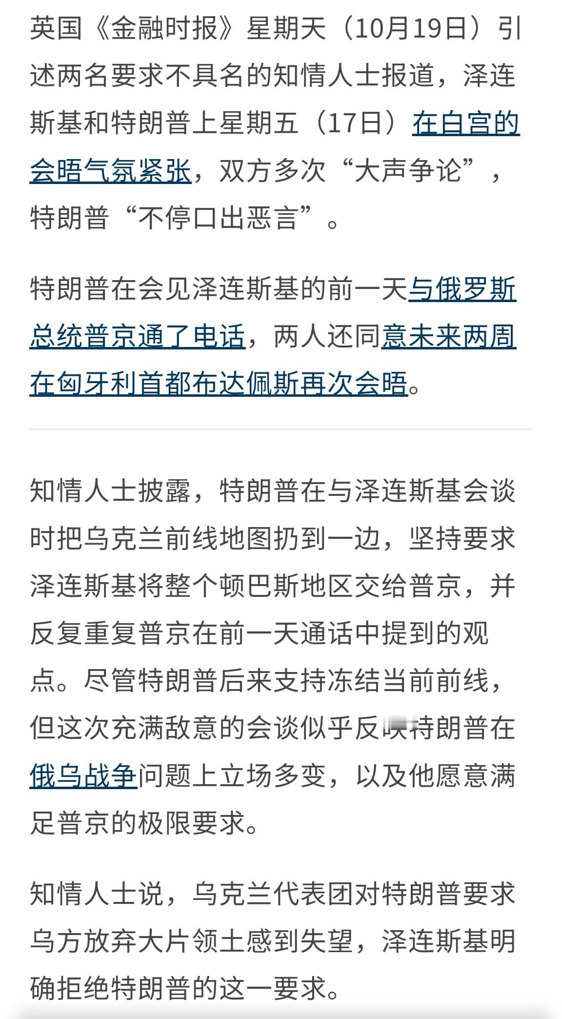 🔻法新社和FT金融时报报道,特朗普在和泽连斯基谈判时气氛紧张,双方不停争论。