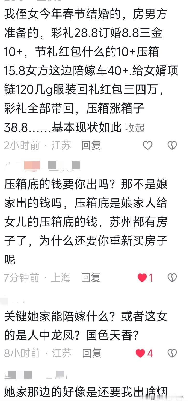 还说我们北方人彩礼高,看这所谓的南方人要这么高,吓人不? 订婚8.8万还不是彩礼?压箱底的我小时候听过,不都是女方放新钱垫四个角吗?这个我奶奶给我姑姑放的时候我看过,还记得,这里变成男方家给了[捂脸]搞笑呢[奸笑][奸笑][奸笑][奸笑] 难怪年轻人都看透了,有这么多钱自己花不香吗?弄一个这样的人来家里添堵啊?家里人难缠的基本上孩子都是一个德行,通情达理的人家根本不会狮子大开口,孩子也差不到哪里去[吃瓜群众][吃瓜群众][吃瓜群众][呲牙] 图二这人说的好像自己吃亏了,仔细一算,还不是吃男方💰!真的非常搞笑,算来算去都是从男方口袋里掏[捂脸]太搞笑了!