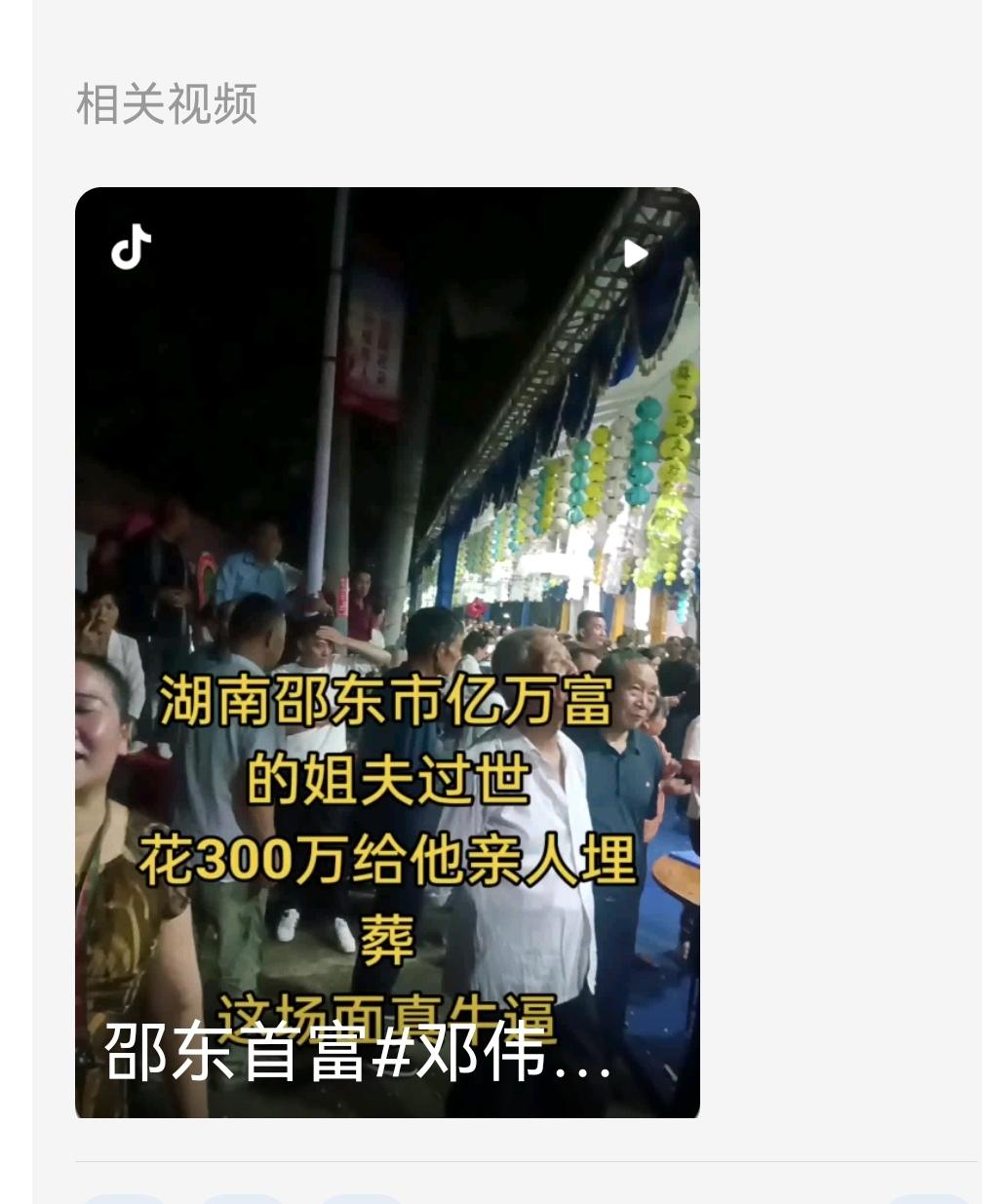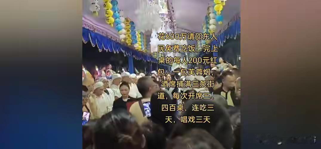 曝邵东首富亲姐夫葬礼狂花300万,方圆十里,乡亲白吃白抽领红包 湖南邵东一场豪掷300万的葬礼引发热议,逝者为邵东首富邓伟民的亲姐夫李伯亮。这位身家不菲的逝者,其葬礼排场堪称奢华。 现场人山人海堵满道路,三条街铺满酒席,每日开席400桌连办三天,乡亲上桌即得芙蓉王香烟与200元红包,跟随送葬还能再领红包。出殡用32抬“二龙杠”,配cos西游记师徒的引路队伍,金丝楠木棺材传值50万。 这场葬礼被指带动当地消费,但也引发争议。有网友感慨贫富差距,也有人认为铺张浪费,不如投身慈善更有意义。作品声明:内容取材于网络,个人观点仅供参考。