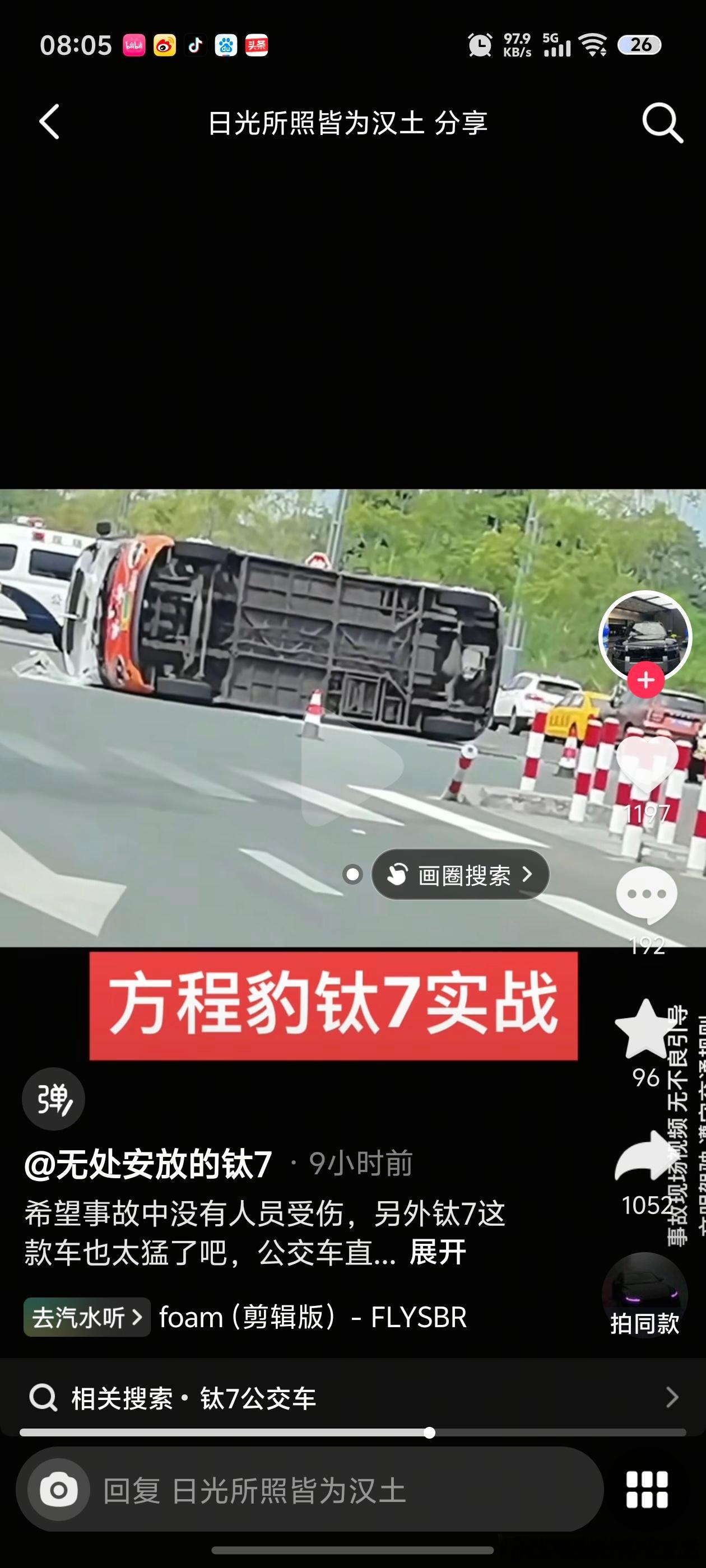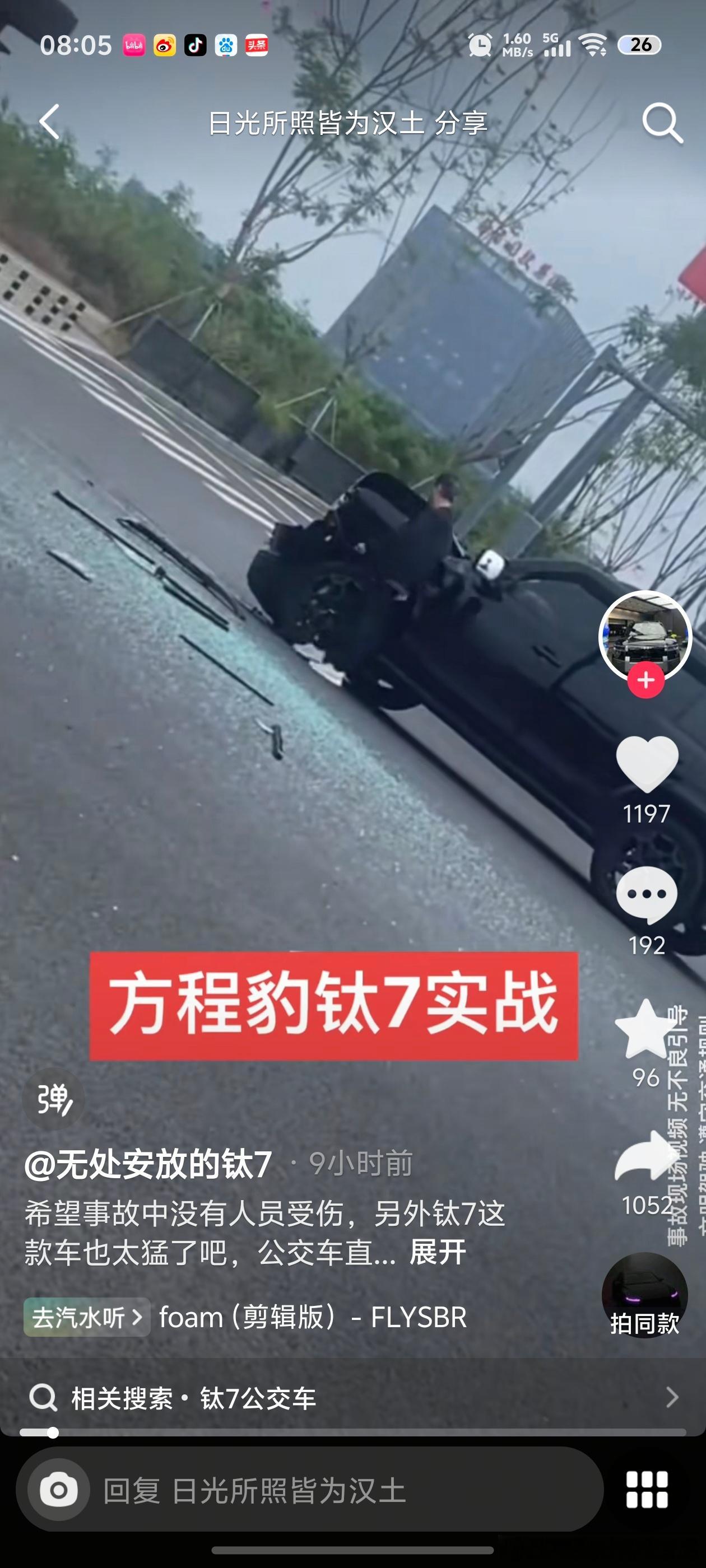 方程豹钛7车祸现场实战,撞翻了一辆公交车,钛7车头受损,人员无碍。目前不清楚公交车情况,希望人员都能平安。最后说一句,大家开车要注意安全,买车还是得买安全性高的。