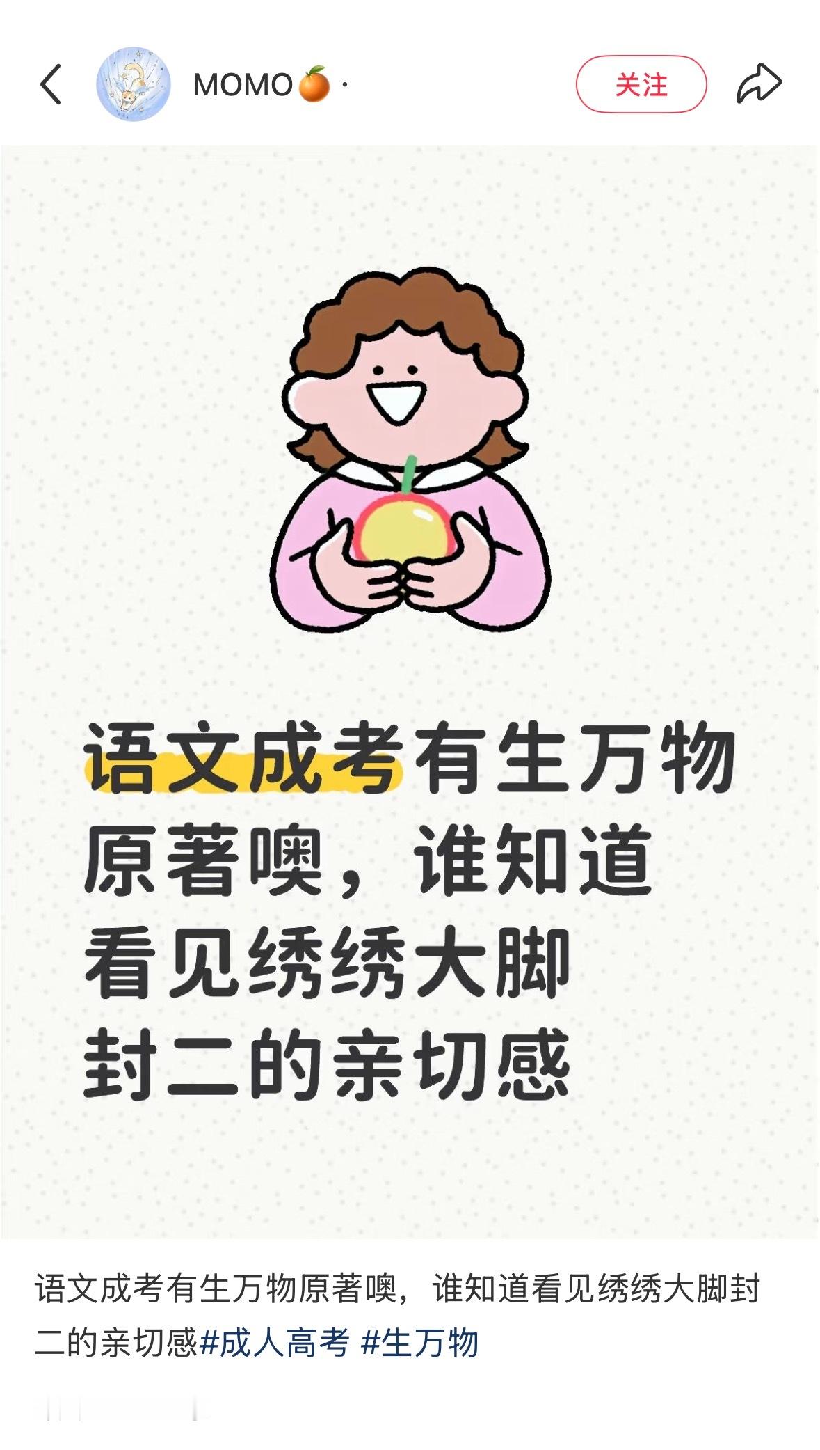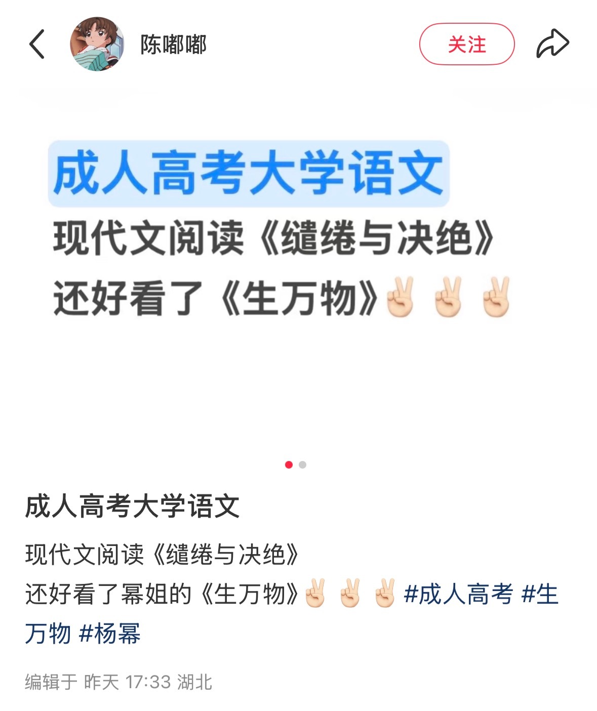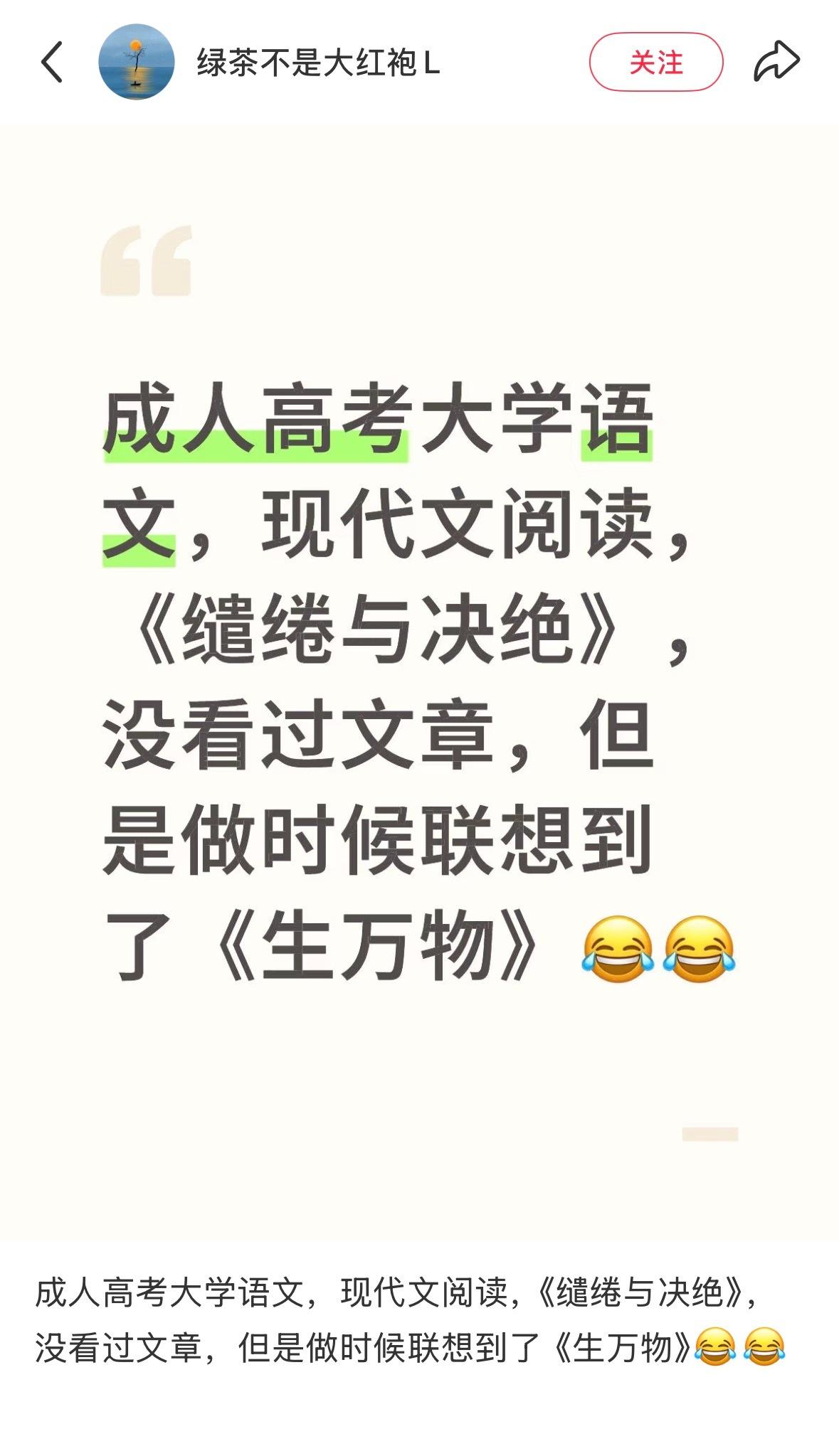 杨幂生万物 昨天成人高考,大学语文出现了《生万物》原著,有考生说还好我看了幂姐的这个剧!好亲切~[偷笑][偷笑]