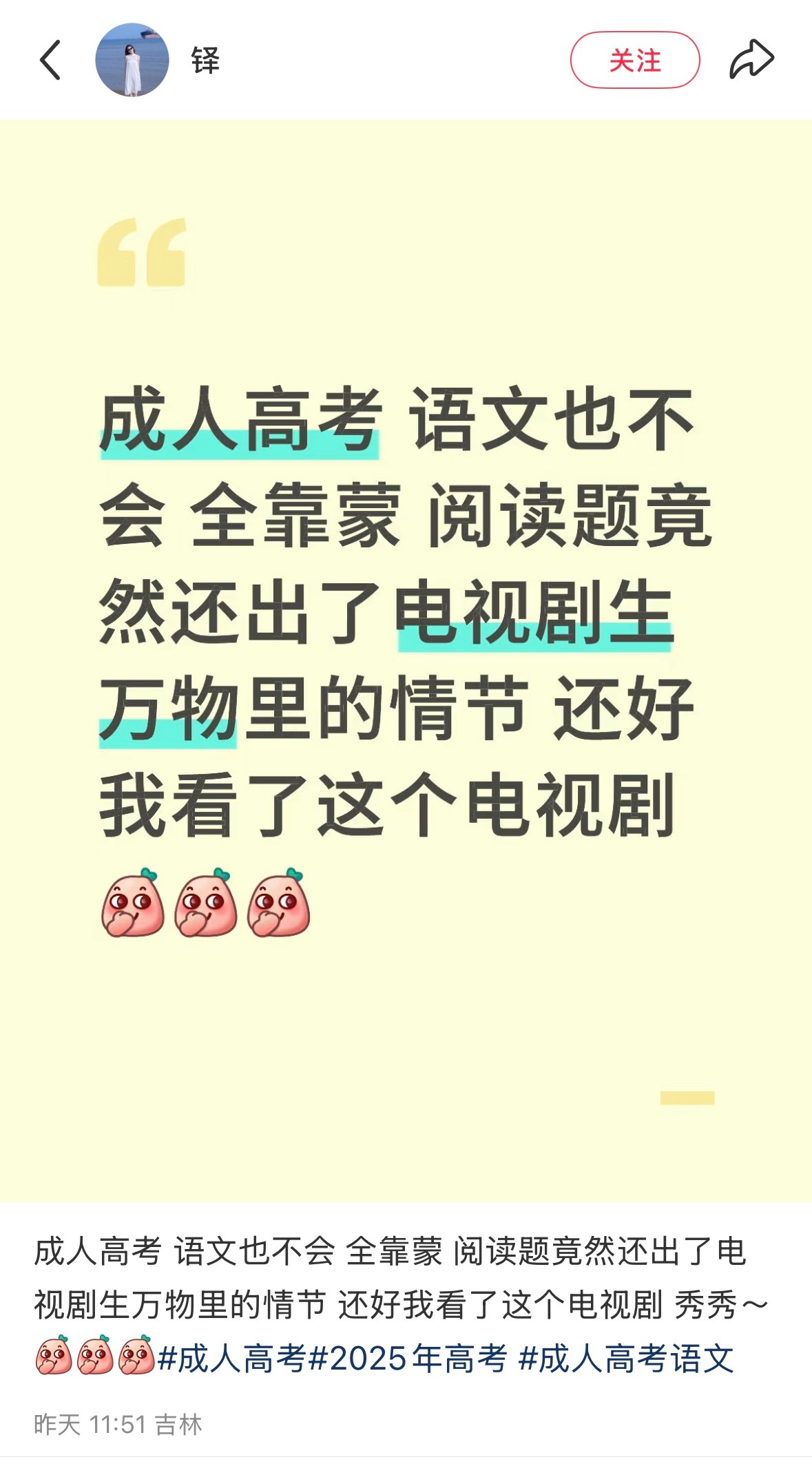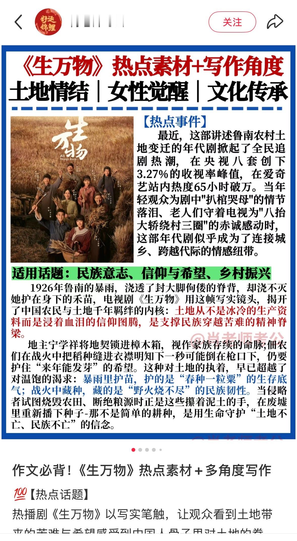 联想到之前《生万物》出现在了全国中学生读的《二十一世纪学生英文报》,还有从热播期开始就有不少老师总结的考公热点,教育领域覆盖真全面!这个《生万物》真的太火了🔥杨幂宁绣绣