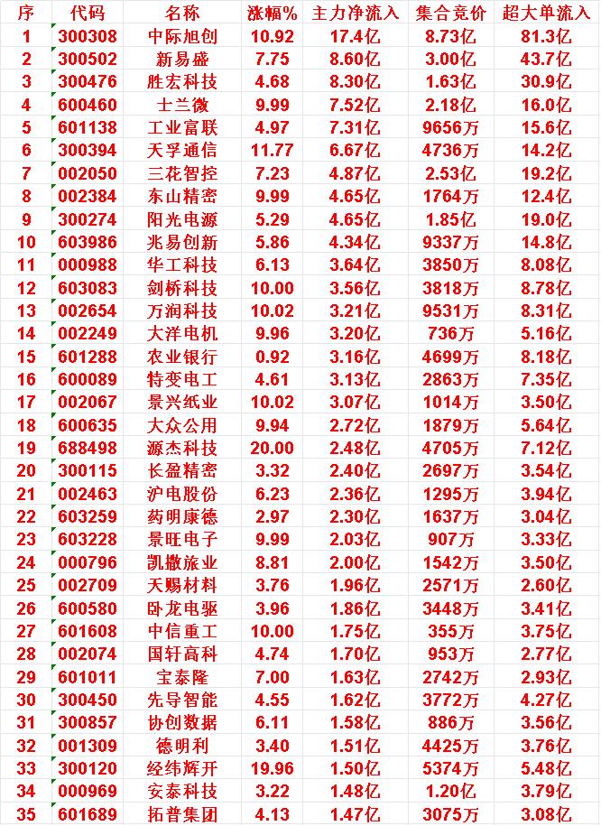 10月20日开盘45分钟,主力资金“买入的 ”的35名单一览! 中际旭创:主力净流入17.4亿元 新易盛:主力净流入8.60亿元 胜宏科技:主力净流入8.30亿元 士兰微:主力净流入7.52亿元 工业富联:主力净流入7.31亿元