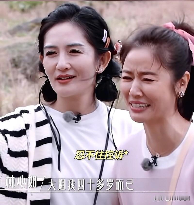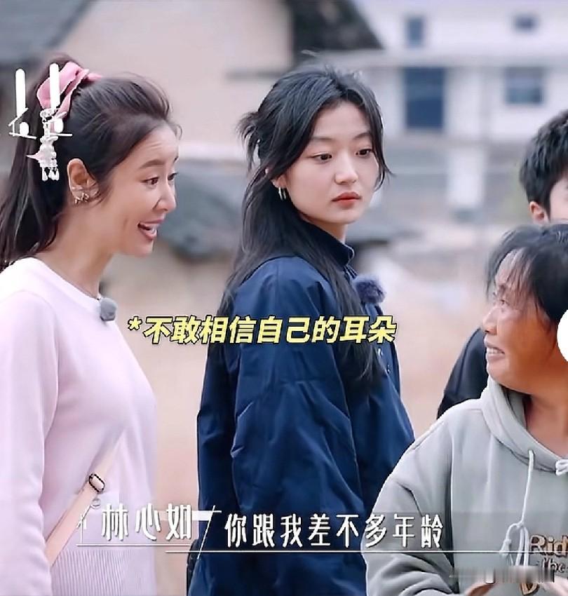 林心如2025-1976= 49(岁),跟五十多能差多少? 阿姨说年龄差不多,但是林看起来那么年轻,是在夸奖她!阿姨倒是很质朴,做人也敞亮。 有没有发现年轻的孙千穿的深色系,反而年龄大的林心如穿个粉红色上衣、粉色发带,谢娜扎的可爱小啾啾。