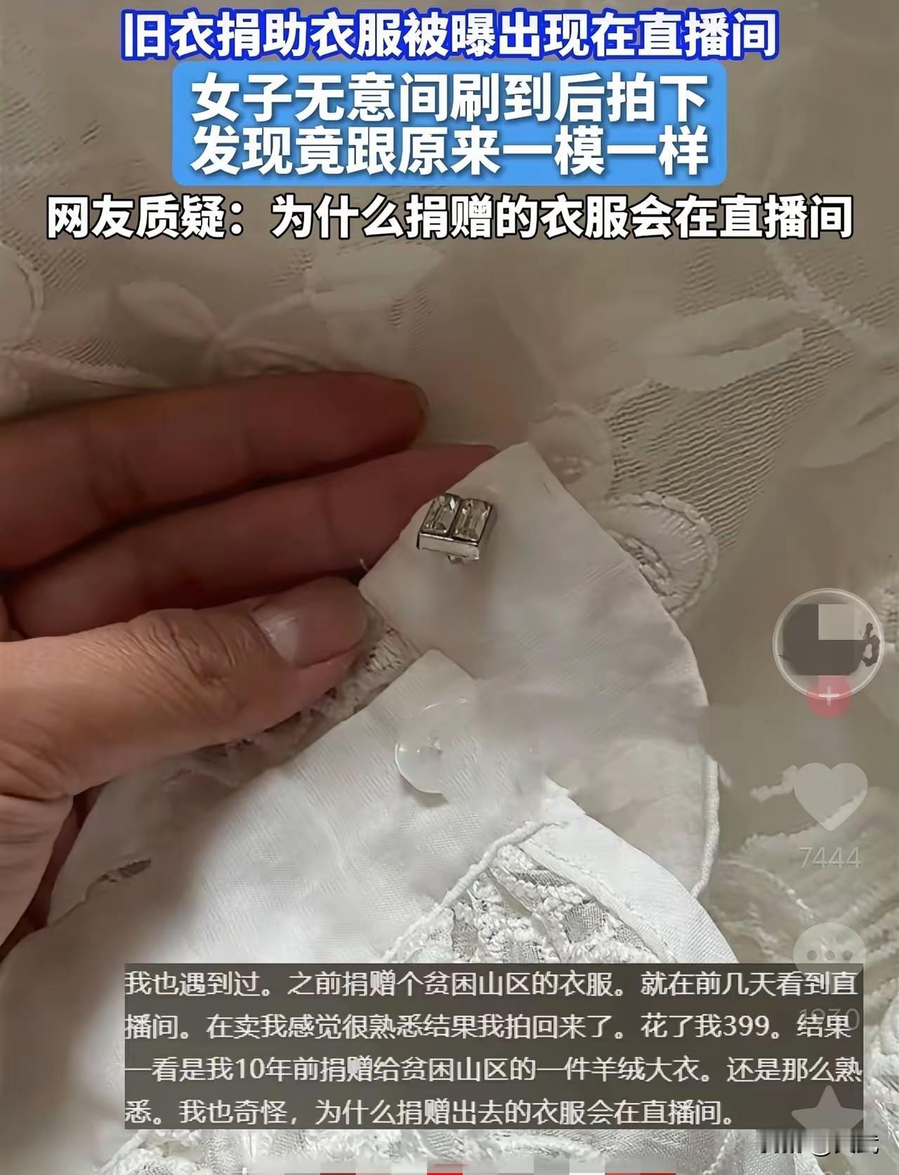 十年前,王女士将一件自己的旧衣捐往贫困山区,十年后,她在直播间刷到这件衣服,为了确认,她花费 399 元买回。看到那枚自己亲手缝上的纽扣,她震惊不已:自己捐出的衣服,怎会出现在直播间售卖?它真的到了贫困山区那些需要的人手中吗? 翻阅评论区,类似情况不在少数。有网友爆料,当地一家打着公益回收旧衣服的机构,衣服随意堆放在公司仓库,半年无人问津。后来,回收商前来收购,一件衣服仅卖一两块,还挑三拣四,不好的衣服继续堆积,像垃圾一样形成一座小山。从此,这位网友对旧衣捐赠彻底失望,直接将旧衣服丢进了垃圾桶。 若真如此,实在令人心寒。公益本应是传递爱心的桥梁,却成了某些人牟利的工具。捐赠者的善意被辜负,贫困地区的需求被忽视,这种乱象必须得到遏制。 公益机构应加强自律,确保捐赠物资的合理分配与使用。同时,相关部门需加强监管,对违规行为严肃处理。公众也应提高警惕,选择正规渠道捐赠,让爱心真正抵达需要的地方。