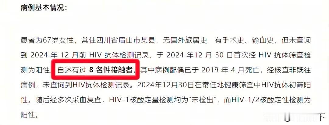 67岁,8个伴侣,二三十岁的你过得是清汤寡水,六七十岁的人家玩得是轰轰烈烈,以前觉得老人都很保守,现在发现他们处在开放的前沿。 ​ 四川发现首例HIV-2感染者,要知道这个东西之前是在非洲流行的,怎么会传到四川呢,感染者是一名67岁的大妈,常住眉山市,没有出过国,她自爆有8个甜蜜伴侣,在2022年也就是她64岁的时候接触了一名湖南的HIV-2型感染者,并且发生了密切关系,估计就是那个时候染上的,都64岁了图啥呢,这下好了全国出名,其它的甜蜜伴侣估计也吓得睡不着觉了吧! 近年来,老年人群艾滋病感染比例持续增加,据悉我国空巢老人超1.18亿,商业性行为高发,不少老年人在伴侣去世或离婚后,通过相亲、跳广场舞等结识新伴侣,但部分人因“年纪大了不用避孕”“都老夫老妻了”等观念,忽视安全套的使用——而安全套不仅是避孕工具,更是阻断艾滋病、梅毒等性传播疾病的关键屏障。