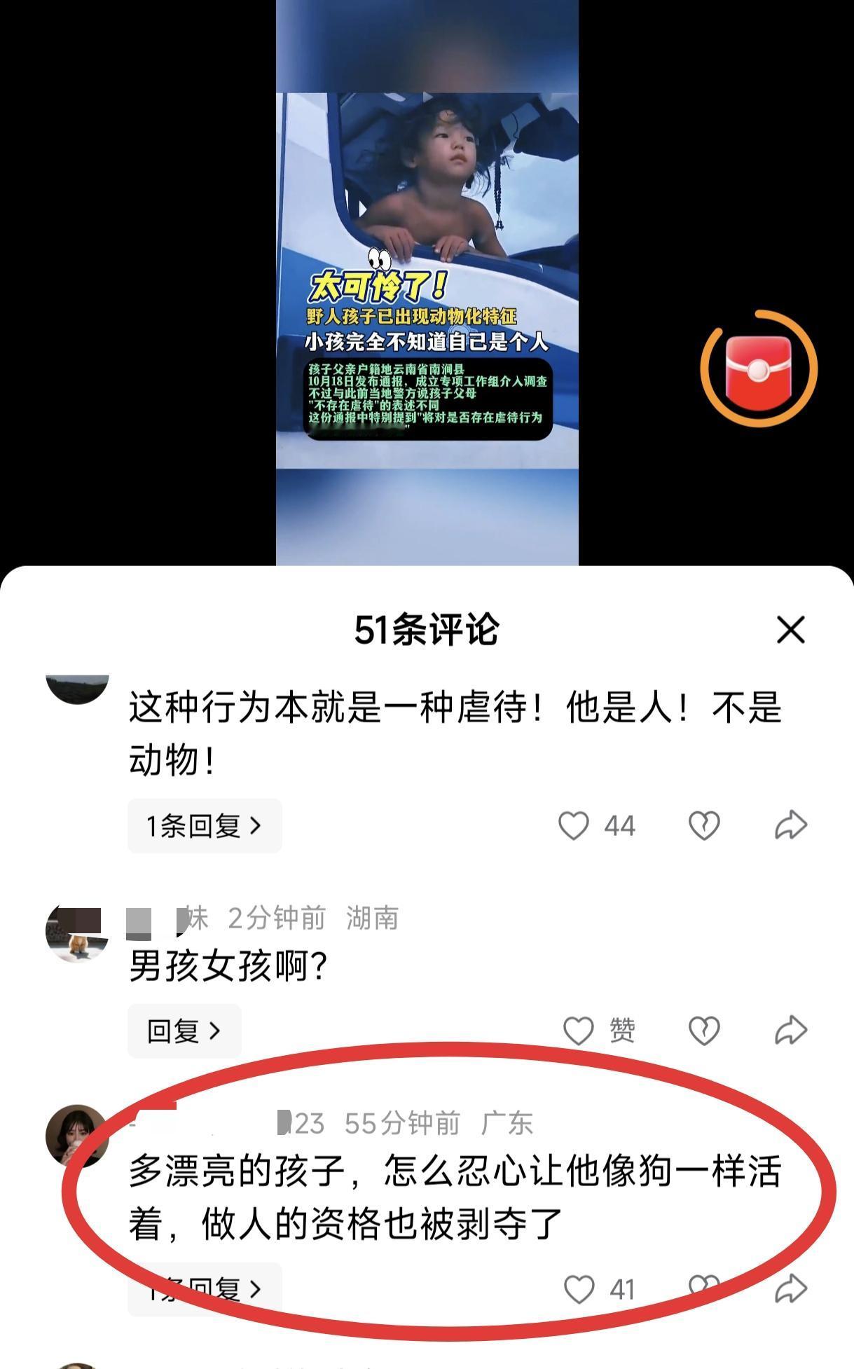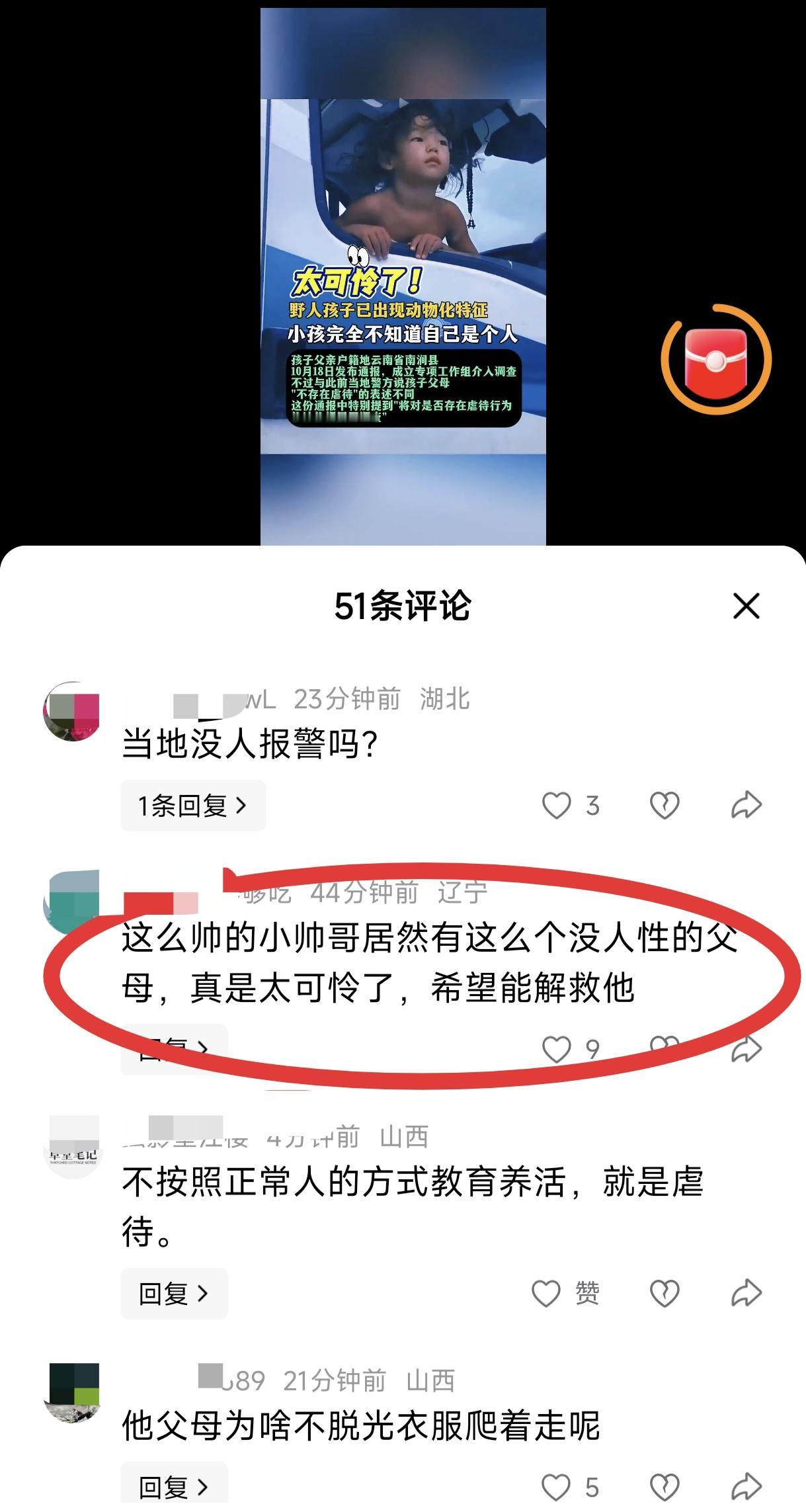 “野人小孩”原来长这么好看:长相清秀漂亮,又不失帅气,眼神很清澈,脸蛋圆圆的,头发黑黑的,就是转头有点机械,看向远方时眼神有几许忧郁。 这一幕被网友拍到了。 很难想象,这样的一个孩子,如果拿去好好洗一洗,将头发理一理,再让他好好接受教育,会是怎样完美的一位小帅哥,得是多少妈妈的“心头宝”。 可事实是,他被家长当狗一样养育,一年四季不给穿衣服,让他全身赤裸、手脚并用爬行,就连好心人给他食物父亲也让摆地上吃。从小男孩嘴刁东西、跑动爬行的娴熟程度看,这样的形成并非一朝一夕。 男孩的身世也令人存疑,父母究竟是不是亲生还有待考证,毕竟几乎没有哪一对父母会如此对待孩子。据当地村民透露,她第一次在村里见到小男孩是在2023年夏天,当时他被父亲领着在小卖部附近玩耍,一丝不挂,头发乱糟糟,身上脏兮兮,不会说话。 按说父母都接受过高等教育,父亲是大学学历,母亲还是研究生学历,这样的事根本就不会发生。 但这一对父母愣是奇葩至极,有房子不住,偏带孩子进深山搭窝棚住,远离村人。有村民去年冬天看见男孩父亲带着他和狗在公路上晒太阳,当时刚下过雪,很冷,孩子父亲穿着珊瑚绒睡衣,孩子则一丝不挂,像狗一吐舌头,嘴里发出怪异的声音。 这真是令人太痛心了! 所幸昨日潇湘晨报报道了好消息,称孩子父母近期会将孩子落户北京,也不再让孩子再赤裸爬行了。 衷心希望孩小男孩能早日正常行走、吃饭、说话与读书,等等,真正地融入社会接受文明与教育。 最主要的是当一个真正的“人”! (图片来自网络,如侵则删除)
