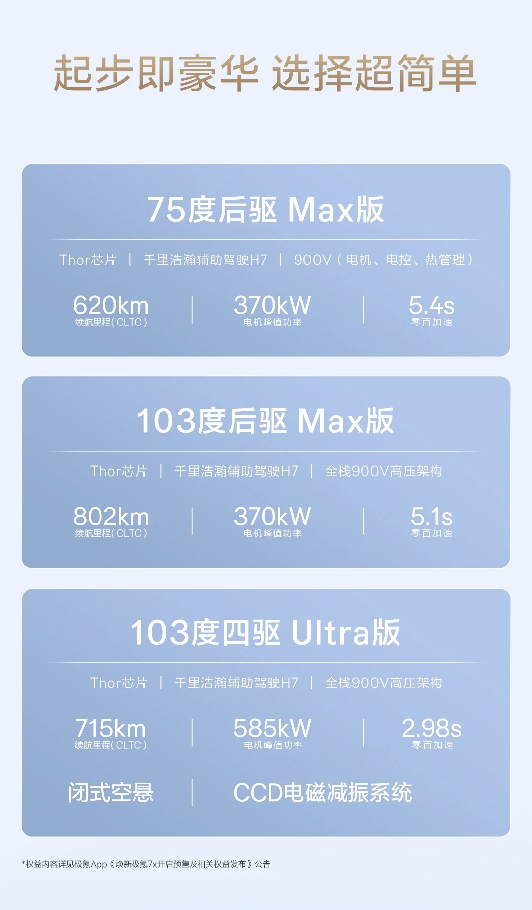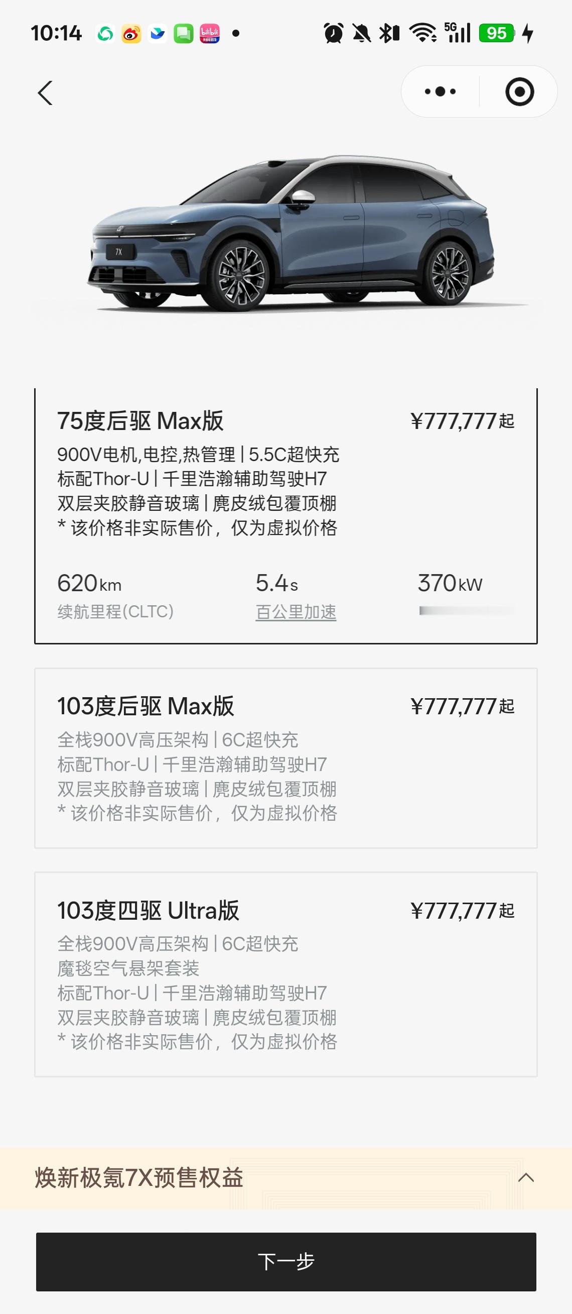 75度版本,感觉纯粹是来拉低售价的,cltc续航只有620km太少了;没性能需求,103度后驱Max,cltc续航802公里,显然是走量的版本[揣手]极氪7x大v聊车焕新极氪7X开启预售
