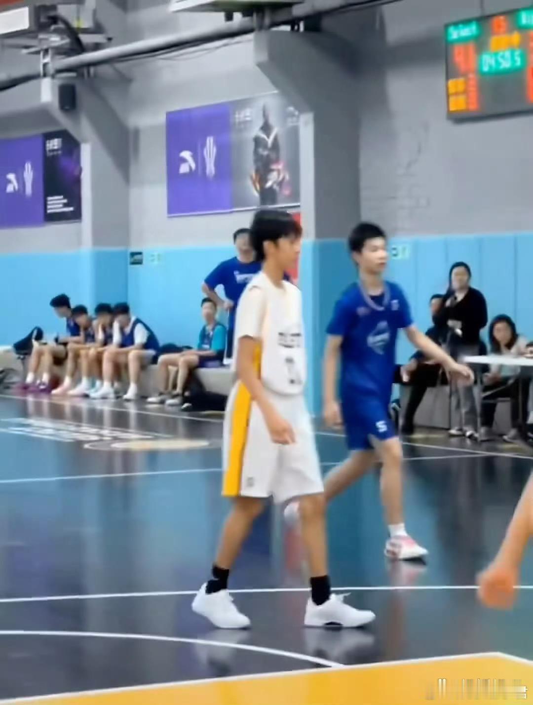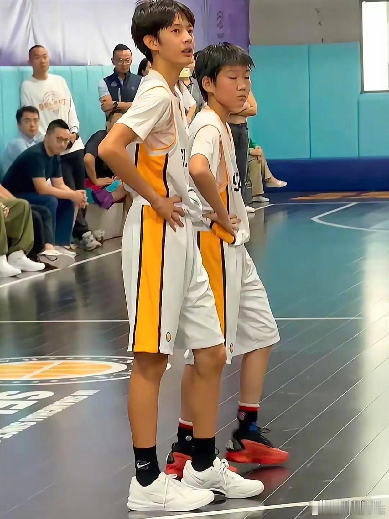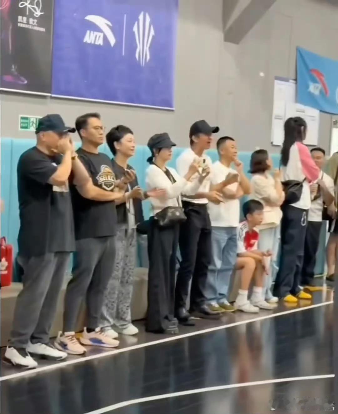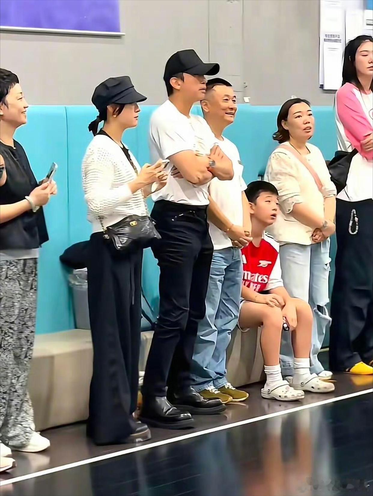 邓超和孙俪在上海体育馆看儿子打篮球比赛,夫妻俩穿着日常服饰,亲自站在场边支持儿子