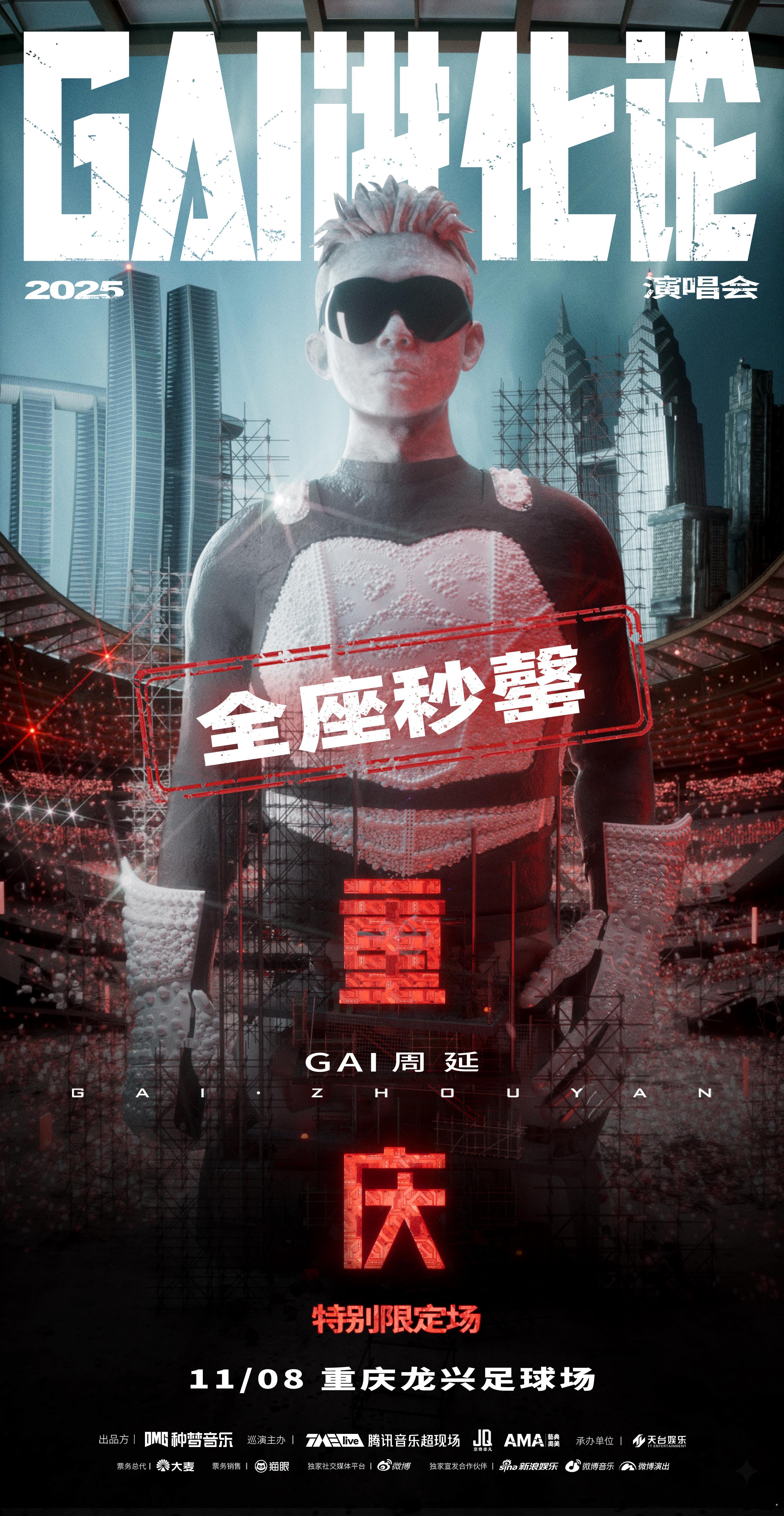 GAI重庆演唱会抢票 《GAI进化论》重庆站的票,简直是秒抢的节奏!抢到的朋友肯定开心到飞起,11月8日重庆见!GAI的强大舞台魅力,嘉宾阵容也是超级引人期待!不容错过的演唱会!
