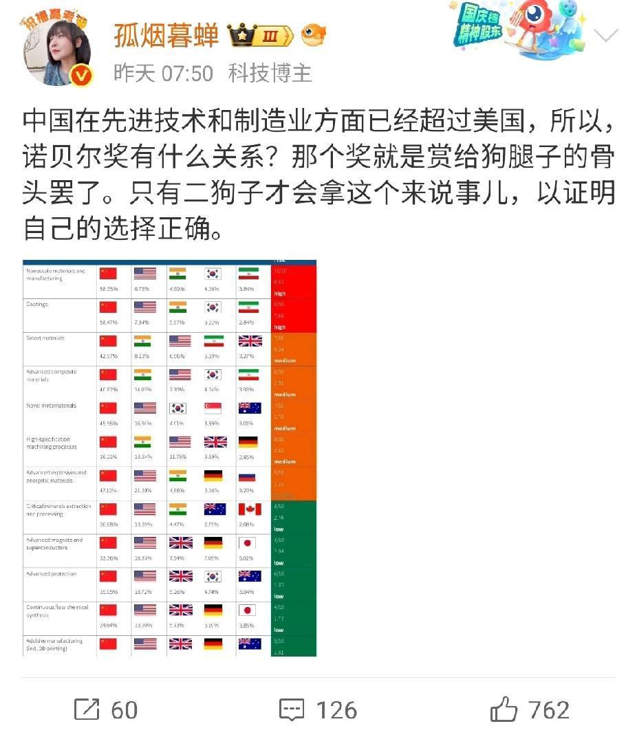 孤烟暮蝉这回惹麻烦了!杨老刚去世,她就说诺奖是“赏给狗腿子的骨头”,这不是连屠呦呦女士都骂了?你可以说,诺贝尔文学奖有娱乐价值、和平奖是赏赐、经济奖参差不齐,但诺贝乐奖的物理+化学,绝对代表了蓝星人知识的边界,都一棍子打死,确实不妥。