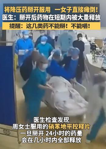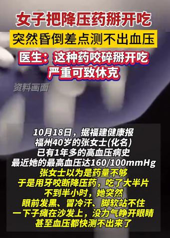 “聪明过头了!”10月18日报道,湖北黄冈一女子吃了一段时间的降压药后,觉得身体恢复得差不多了,就擅自将降压药掰开吃,结果不到半个小时,女子就两眼发黑、四肢无力倒在地上,被紧急送往医院治疗。网友:就怕蠢人灵机一动! 10月15日,湖北黄冈42岁的周女士因为血压骤降被送进急诊,医生检查发现她的收缩压只有80mmHg,追问之下才知道,她把降压药硝苯地平控释片掰成两半吃了。 周女士吃了一段时间降压药,测血压发现控制得不错,就觉得可以减量了,她想着药吃多了对肝不好,掰一半既省钱又减少副作用,没想到半小时后就晕倒在厨房。 这次事件的关键在于,控释片绝对不能掰开吃,硝苯地平控释片采用的是渗透泵技术,药片外面有一层特殊的半透膜,里面有助推层,通过一个小孔持续24小时缓慢释放药物。 一旦把药片掰开,这套释放系统就彻底被破坏了,相当于一次性把全天的剂量都吃进去,药物瞬间大量进入血液,血压当然会急剧下降,这就像水库泄洪,闸门慢慢开是安全的,一下子全开就会出问题。 生活中很多人都有过掰药片的想法,有的是觉得药片太大不好吞,有的是自作主张想减量,还有的是为了省钱让一盒药吃更久,但并不是所有药片都能掰开。 除了控释片,缓释片也不能掰,这两种药的设计目的就是延长药效,减少吃药次数,原本一天吃三次的药,做成缓释片就能一天只吃一次,方便患者坚持用药。 肠溶片也禁止掰开,这类药外面包了一层特殊的保护膜,让药物能顺利通过胃部,到达肠道才开始溶解,比如阿司匹林肠溶片,掰开吃会直接刺激胃黏膜,引起胃痛甚至胃出血。 胶囊同样不建议拆开,胶囊壳除了能掩盖药物的苦味和异味,还能保证剂量精准,有些胶囊里的药粉遇到空气或水分会失效,拆开倒出来吃,药效可能打折扣。 那怎么判断药片能不能掰?最简单的办法是看药片表面有没有刻痕,有一道凹槽的药片,比如某些美托洛尔缓释片,通常可以沿着刻痕掰开,表面光滑没有任何标记的,基本上都要整片吞服。 更保险的方式是仔细看说明书,说明书上会明确标注这个药能不能掰开,如果写着“整片吞服”、“不可咀嚼或压碎”,那就一定要照做,实在拿不准,问问开药的医生或者药房的药师。 “这不就是我妈能干出来的事儿吗?血压一正常就觉得病好了,动不动就想给我爸减药,怎么说都不听,看完这个新闻,我得赶紧转发家庭群去,太有警示意义了, 这哪是“聪明过头”,这是拿自己的命开玩笑啊!” “控释片、缓释片这种药,真不是随便能掰开的。原理其实不难懂,就好比一个糖馅大汤圆,你整个吃,糖心是慢慢化开的;要是你硬掰两半,里面的糖一下子全流出来,能不齁着吗?” “药也一样,一下子全吸收,血压唰地掉下来,太危险了。” “评论区有没有医生或者药师朋友,给大伙再详细科普一下,除了硝苯地平,还有哪些常见的药也是绝对不能掰开吃的?比如有些降糖药是不是也不行?让大家心里更有底。” ““是药三分毒”这话没错,但不能理解成“病好了就能随便停药”,高血压这种慢性病,吃药就像是给大坝做维护,水看着不急,但大坝一刻都不能松劲。” “感觉没事,正是因为你按时吃药控制得好,一停药,洪水说不定就来了。 现在年轻人也得注意了,工作压力大,高血压越来越年轻化。” “可别觉得自己年轻身体棒,学新闻里这样“灵机一动”,后果可能更严重,还有个细节提醒大家,送药一定用白开水!茶水、牛奶、果汁什么的,真的可能会和药物起反应,影响效果,这钱和功夫可不能省。” “在健康问题上,最怕这种自作主张的“小聪明”。相信医生、看好说明书,比啥都强。” 你或者你的家人,有没有过类似的“自作主张”服药经历?比如觉得自己好了就停药、把药掰开吃、或者用饮料送药?后来怎么样了?欢迎在评论区分享你的故事和看法,给其他朋友提个醒! 信源:纵览新闻