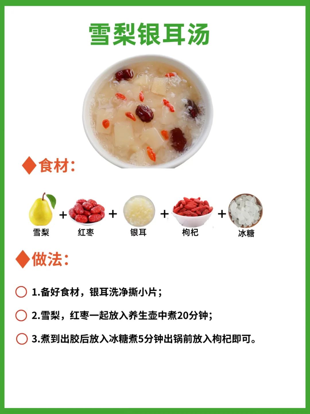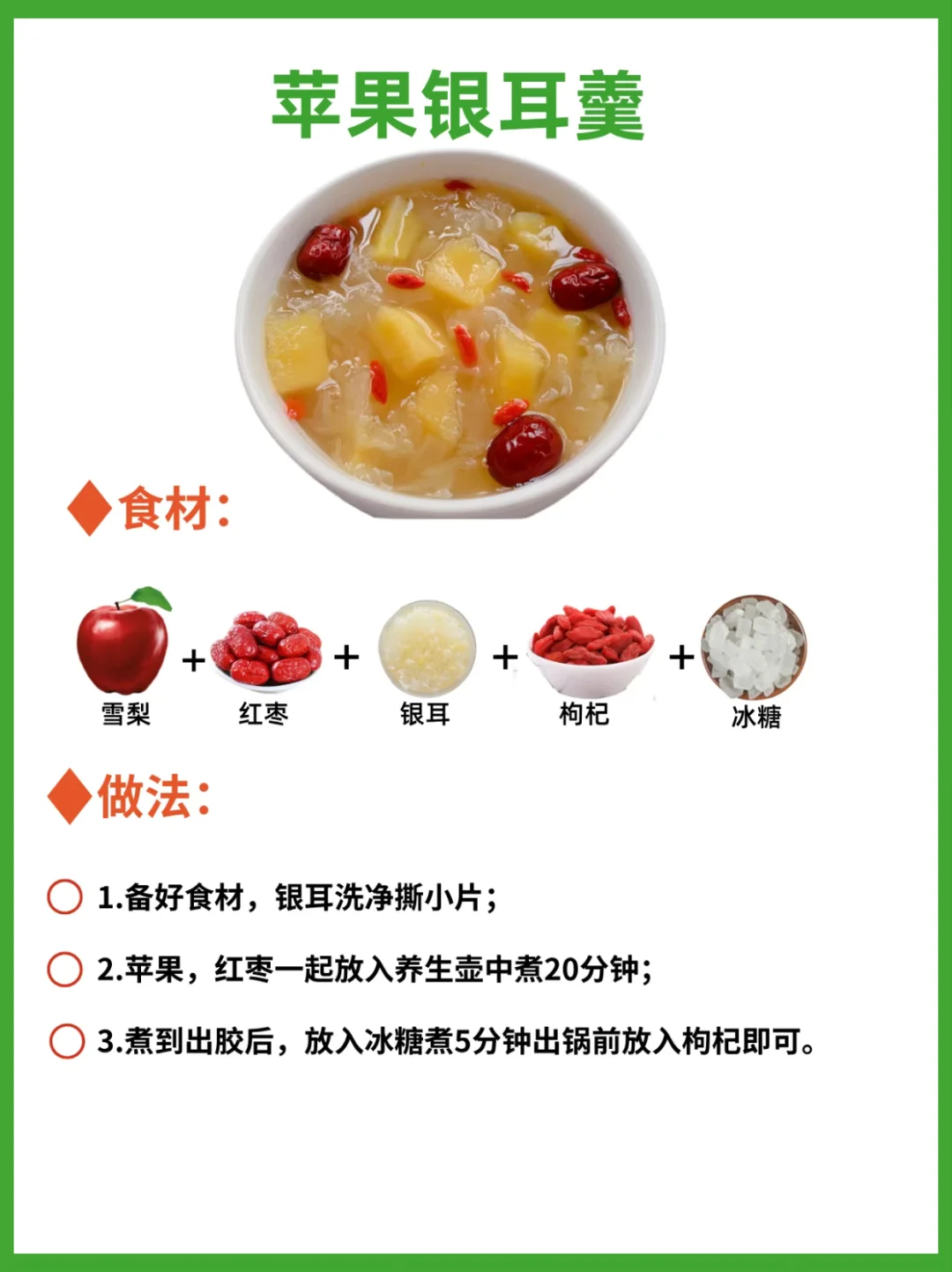 🍂秋冬换季,抵抗力较弱的大小朋友这个时间段容易😷中招感冒咳嗽~ 🌈今天分享6种宝宝食疗法,酸甜好喝,润燥,大人小孩都能喝,一定要试试~~ 👉食谱具体做法如图⬆️ 🔴雪梨🍐银耳汤 🔴苹果🍎银耳羹 🔴百合莲子🥣银耳羹 🔴五百润肺汤🥣 🔴苹果🍎山楂水 🔴金桔🍊雪梨水 · ⚠️注意事项: ✔️一岁以下宝宝不加冰糖,喝梨汤水或者打碎了喝 ✔️普通银耳需要提前泡发 ✔️炖煮的时候搅一搅更容易出胶 做法非常简单,可以用家里的砂锅,奶锅,或者养生壶煮熟就可以,全家可以一起喝❤️ 来自