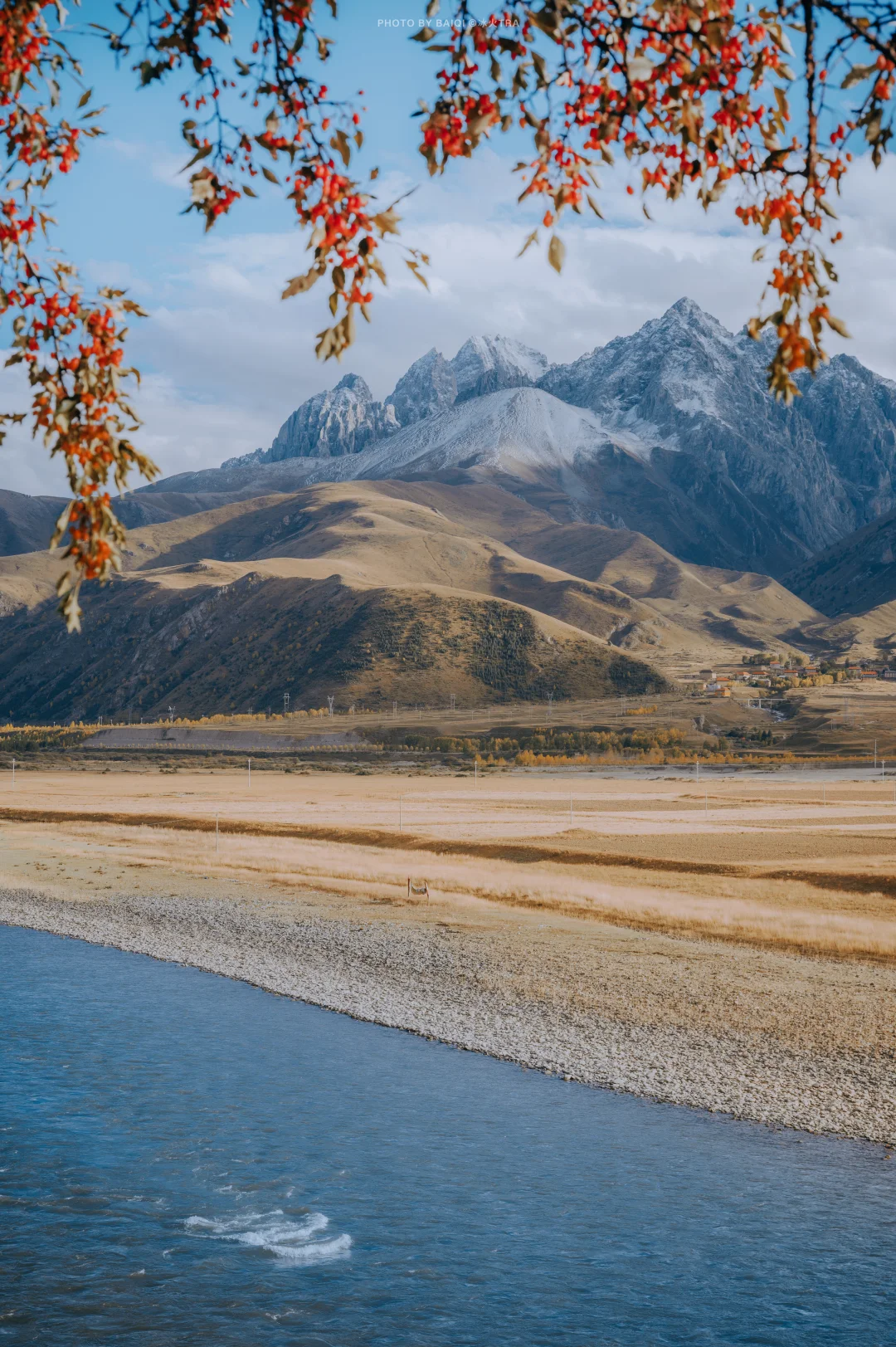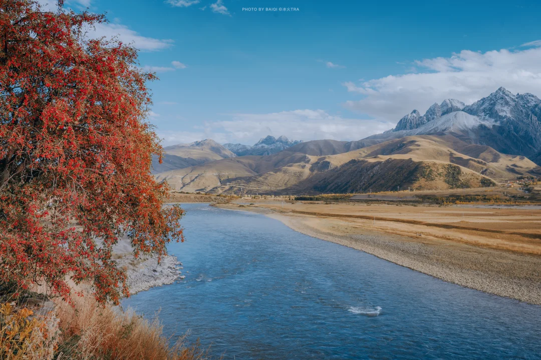 3,俄色果。很多人都知道俄色花,但你们知道俄色也会结果吗?而且俄色果从某种角度来讲,比【花】更有观赏价值,因为它是鲜红色的,在雪山的映衬下堪称绝景。甘孜县就分布着大量的俄色果,在雪山下,在雅砻江边。图7。