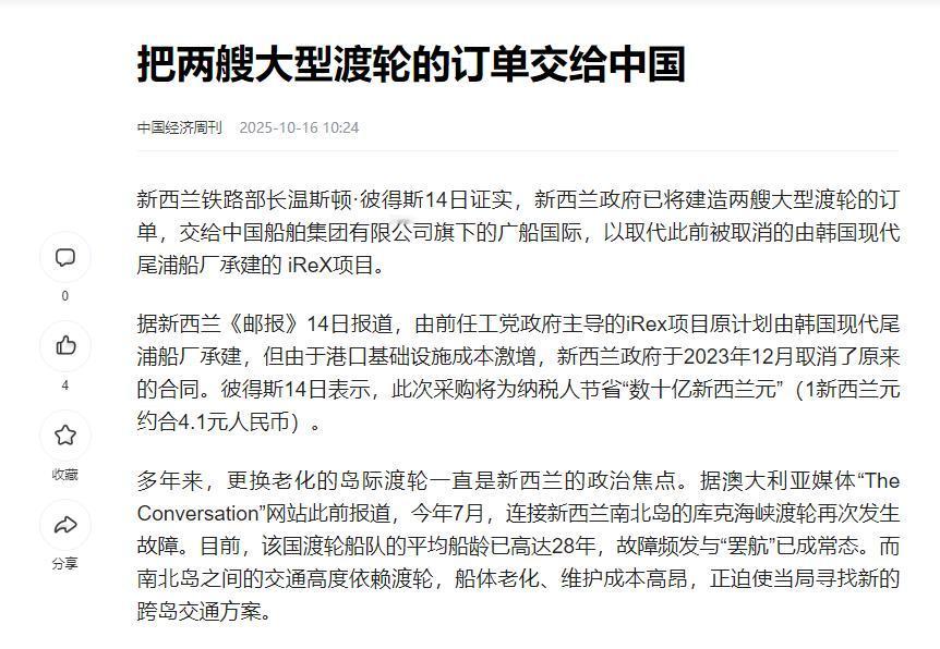 中方反制后,第一个表现诚意,上门求合作的西方国家出现了,美欧都没想到。 2025年10月14日,中国商务部一纸公告,直接把帮着美国搞301调查的,韩国韩华海洋5家美国子公司,拉进制裁清单,国内任何组织都不准再跟它们合作。而在美韩那边还没捋清楚怎么应对呢,新西兰第二天就紧跟着,扔出个大消息。 新西兰铁路部长温斯顿·彼得斯官宣,把两艘大型跨岛渡轮的订单,给了中国船舶旗下的广船国际,而之前跟韩国现代尾浦签的合同说撕就撕,连半点犹豫都没有。 事实上,这可不是新西兰临时抽风,是被韩国船厂坑了7年,实在憋不住了。2018年那会儿,新西兰为了解决南北岛运输堵得要死的问题,跟韩国现代尾浦签了渡轮建造合同,当时说好预算7亿纽币(差不多32亿人民币),2022年就能交货。结果呢? 韩国人硬是把个民用造船项目,搞成了“国家笑话”。拖了整整7年,图纸改了19版,成本一路飙到原来的6倍,眼看2025年都过了大半,船连个影子都没见着。新西兰这边可遭了罪,果农的椰子运不出去烂在港口,游客订了票却等不到船只能退票,岛屿之间的航线砍了一半,国会里政客们拍着桌子骂“再等下去,咱们的岛际经济先沉了”。 就在新西兰快被逼疯的时候,中国广船国际递了橄榄枝。同样规格的渡轮,报价直接比韩国低30%,交期还快一半,承诺4年内准能完工。更让人放心的是,广船直接把“违约金条款”和“交付节点”写得明明白白,连生产过程都用系统实时监控。新西兰一看这架势,哪儿还犹豫?连夜就跟韩国现代尾浦撕了合同,连之前砸进去的6亿纽币前期投入都不要了,就认准了中国船厂。 这边新西兰订单刚落定,那边被中国制裁的韩华海洋,就暴露了大问题。要知道韩国虽然是全球第二大造船国,可70%的船用钢材都得从中国进口,韩华海洋更夸张,它造的军舰、LNG船这些高端装备,35%的关键部件都是中国产的。中国这次制裁专门盯着它的5家美国子公司,表面是罚它帮美国搞调查,实际上是掐断它给美军供货的路子,还逼着韩国造船业在中美之间选边站。 这招一出,韩国造船业直接“内伤”——欧洲两家邮轮公司当天就暂停了,跟韩华海洋的谈判,全球造船股当天就重新排了座次,中国三大船厂的股票全飘红,韩国的份额却从2020年的30%跌到现在的17%,中国反倒占了70%。说真的,韩国也别怪别人,自己效率低得离谱,人家中国船厂都用机器人焊接、全程扫码追踪了,韩国还在用纸质工单,工会甚至连夜班都反对,这差距可不是一点半点。 新西兰敢这么果断“反水”,说到底是算清了经济账。它每年30%的农产品都要卖到中国,美国那边才买它5%的东西,这种依赖度下,谁都不会傻到为了美国的面子丢自己的饭碗。早在2021年,新西兰就拒绝加入美国搞的南海军事巡逻;2023年又单独跟中国升级了自贸协定,当时总理说得特别实在:我们出口靠海洋,海洋靠订单,订单靠客户。这话戳破了美国盟友体系的假面具——所谓的“政治正确”,在实实在在的利益面前根本站不住脚。 这波操作也能看出来,中国的反制早不是以前的被动防御了。首先是法律工具用得越来越熟,《反外国制裁法》从纸面上落到了实处,精准盯着企业下手,既没“误伤”其他公司,又精准打在了美国的战略支点上。其次是产业安全做得足,不光造船业全球领先,稀土、LNG船核心设备这些关键领域都有了自主体系,西方想制裁都找不到突破口。最后是开始主动定规则了,比如联合欧盟起诉美国的航运歧视,还推动更多国家用人民币结算能源贸易,慢慢把主动权攥在了自己手里。 最讽刺的是,美国还在琢磨怎么拉拢盟友围堵中国,中国却用“靠谱的产能+实在的合作”把盟友一个个拉了过来。现在越来越多国家看明白了,跟着美国搞对抗,不如跟中国做生意,美国那套“盟友体系”的马其诺防线,正在被一个个实实在在的订单冲垮。 说真的,要是美国还不清醒,以后上门求合作的西方国家只会越来越多——毕竟谁都不想跟钱过不去,更不想被不靠谱的伙伴坑得血本无归。就像新西兰这次,宁可亏掉6亿纽币也要换中国合作,不就是因为吃过亏才明白,靠谱比什么都重要?反观美国,天天喊着“盟友优先”,可真到了关键时刻,除了让盟友当炮灰,还能给什么实际好处?估计接下来,不少西方国家都会偷偷算自己的账,毕竟在生存和利益面前,没人愿意当美国霸权的垫脚石。