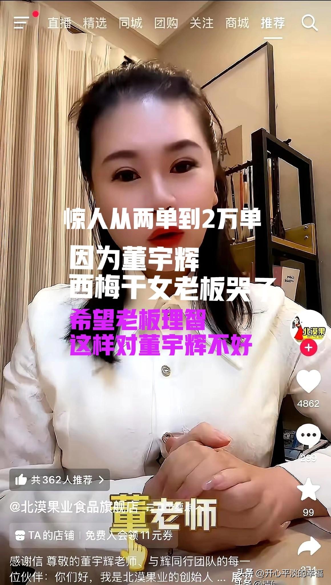 西梅干女老板哭了。但她新疆西梅干 不应该这样做 董宇辉来了一个晚上以后西梅干的销量从一天的两单一下冲到了2万单。老板说他们临时招了很多当地的女性加班加点,让她们有了事情做。真的很感谢董宇辉。 但是想说,老板不应该把视频发出来,对董宇辉不好。 如此好的西梅干难道只有董宇辉卖才会有人买吗?种西梅的果农很多,寒风中的他们手中的西梅咋办呢?还有董宇辉离开后,剩下的西梅干,还能卖掉吗?