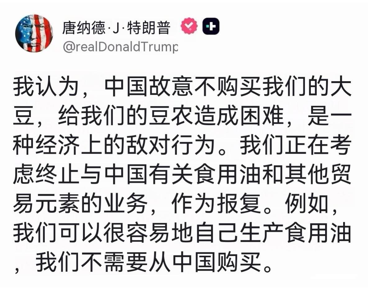 言下之意,这是要发扬南泥湾精神? 面对反制自力更生,艰苦奋斗,丰衣足食? 川宝儿唉! 你可知道大豆可不是只能榨油哦。 中国人有一百个吃大豆的花样,随便一个豆制品都能把你家的豆子消耗一大截。 没办法,你们有空多来中国多喝点儿豆腐脑,补补脑子吧。