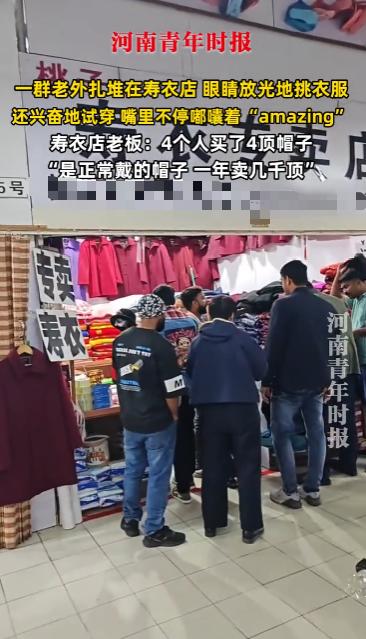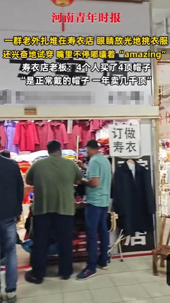 10月20日,江苏镇江,一群老外扎堆在寿衣店门口挑选衣服,看着墙上挂的衣物他们眼睛放光,几人还兴奋试穿,嘴里不断称赞道“amazing”,最后买了几顶帽子走了,网友:老外理解的是不是能使人长寿的衣服。 一家寿衣店迎来了几位特殊的客人,他们在路过时被店内售卖的寿衣深深吸引,不禁驻足观看,店老板看到几幅外国面孔,也觉得很新奇。 几名外国人走进寿衣店内,看着店里一些古色古香、颜色艳丽的寿衣眼睛直放光,挑选中还试穿了几件,看得出来他们十分喜欢。 也许是这些带有中国特色的衣物让老外们觉得很惊奇,进店后他们的嘴里不停嘟囔着“amazing”,这个英文单词翻译成中文就是令人惊奇的意思。 在店老板的介绍下,这几名老外最终买了四顶帽子,这帽子是正常戴的帽子,一年能卖出几千顶,没什么特殊的寓意和忌讳。 不少网友表示,老外是不是以为寿衣就是令人长寿的衣服,这也是有可能的,对中文不熟练还真有可能造成这样的乌龙! 信息来源:《一群老外扎堆寿衣店挑衣服,还兴奋试穿,嘴里嘟囔着“amazing”》河南广播电视台