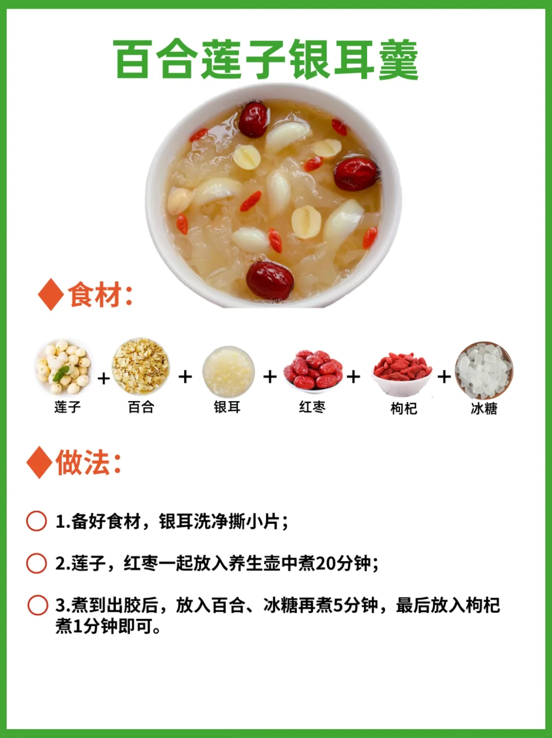 🍂秋冬换季,抵抗力较弱的大小朋友这个时间段容易😷中招感冒咳嗽~ 🌈今天分享6种宝宝食疗法,酸甜好喝,润燥,大人小孩都能喝,一定要试试~~ 👉食谱具体做法如图⬆️ 🔴雪梨🍐银耳汤 🔴苹果🍎银耳羹 🔴百合莲子🥣银耳羹 🔴五百润肺汤🥣 🔴苹果🍎山楂水 🔴金桔🍊雪梨水 · ⚠️注意事项: ✔️一岁以下宝宝不加冰糖,喝梨汤水或者打碎了喝 ✔️普通银耳需要提前泡发 ✔️炖煮的时候搅一搅更容易出胶 做法非常简单,可以用家里的砂锅,奶锅,或者养生壶煮熟就可以,全家可以一起喝❤️ 来自