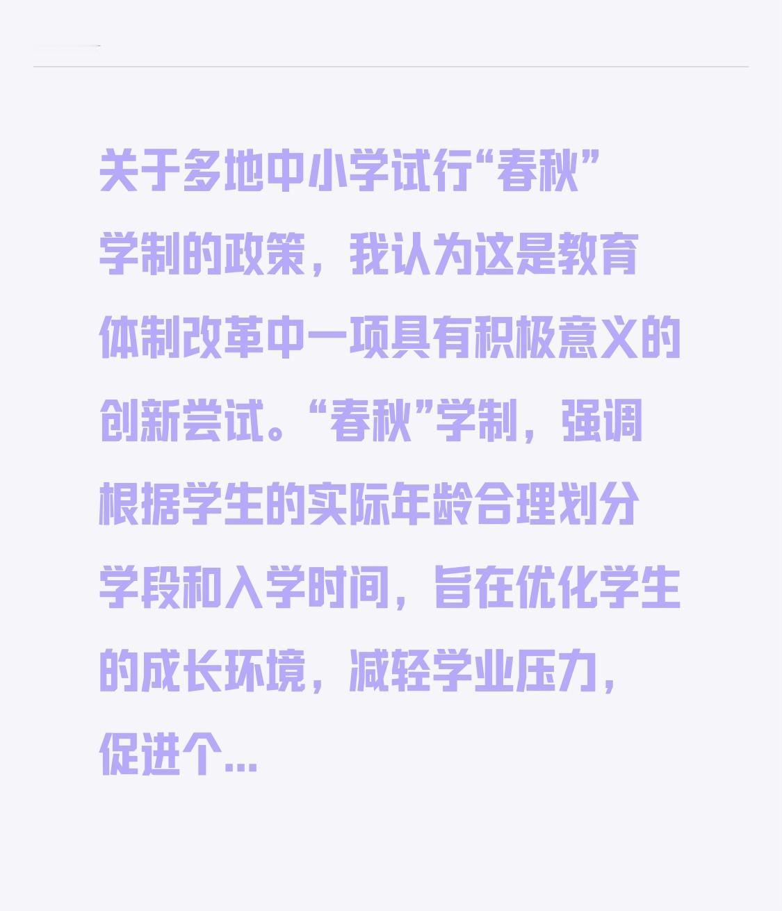 关于多地中小学试行“春秋”学制的政策,我认为这是教育体制改革中一项具有积极意义的创新尝试。 “春秋”学制,强调根据学生的实际年龄合理划分学段和入学时间,旨在优化学生的成长环境,减轻学业压力,促进个性化发展。 我的看法如下: 促进教育公平:合理调整入学年龄,有助于缩小不同地区、不同家庭背景学生之间的差距,为更多孩子提供公平的起点。 关照学生个体差异:不同孩子的成长节奏不同,春秋制可以更好地适应个体差异,让学生在更适合自己的时间点开始学习和成长。 减轻学业压力:通过科学的入学年龄安排,减少“早入学”带来的焦虑,有助于培养学生的兴趣和创造力。 需科学稳妥推进:在推广过程中,应结合地区实际情况,逐步试点、完善政策,避免盲目跟风,确保改革的科学性和有效性。 挑战与适应:新政策可能带来课程衔接、学籍管理等方面的挑战,需要教育部门和学校共同努力,确保平稳过渡。 总体而言,试行春秋制是推动教育公平与个性化发展的积极探索。未来应继续听取各方意见,结合实际情况,逐步完善,为学生的全面发展创造更有利的条件。