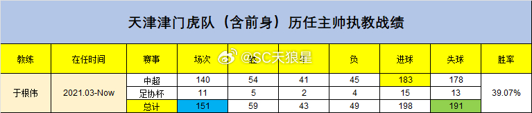 3. 于指导带队第140场中超联赛,这150场比赛,球队54胜41平45负,进183球丢178球。(图3)