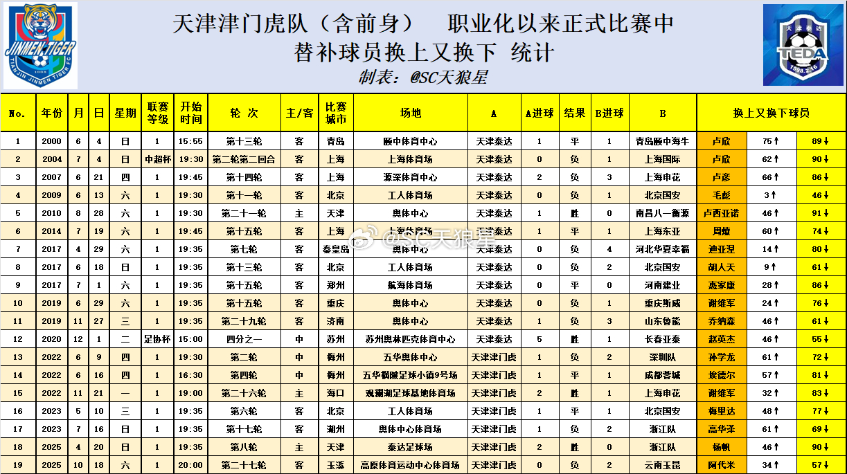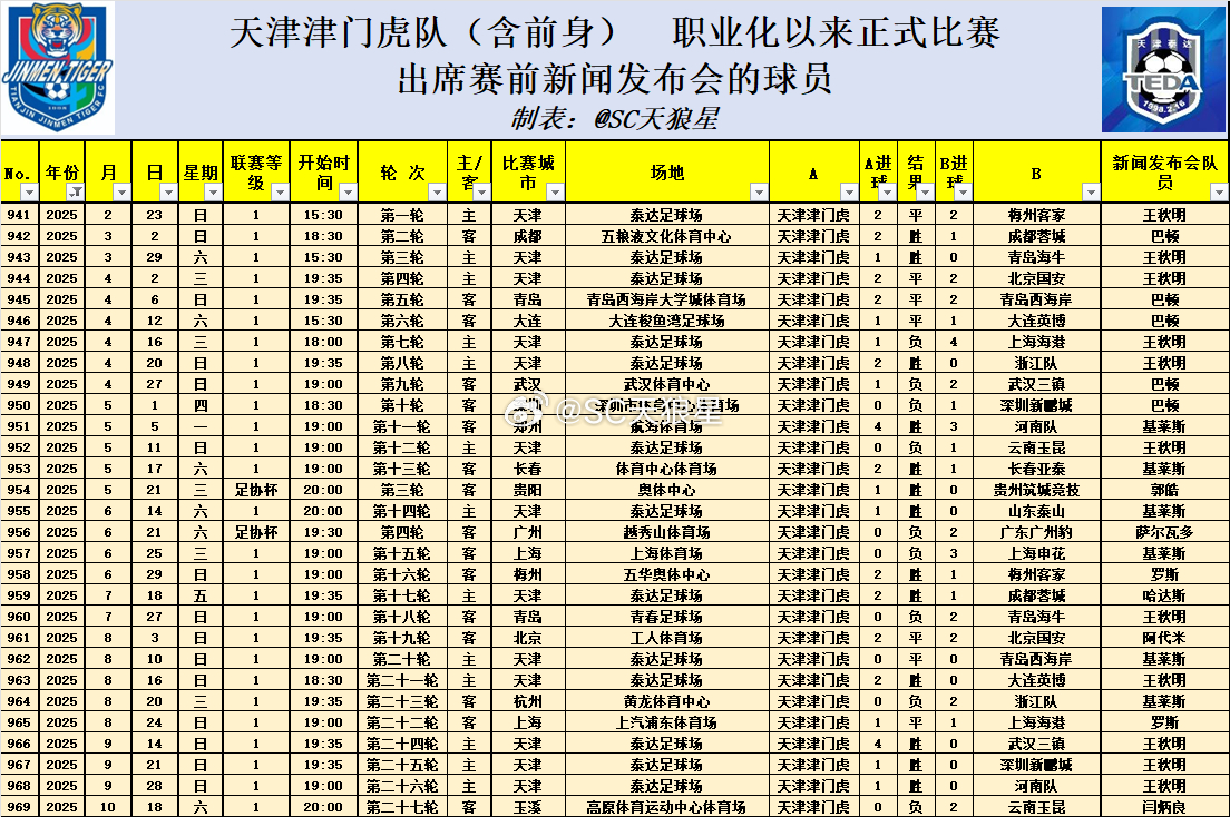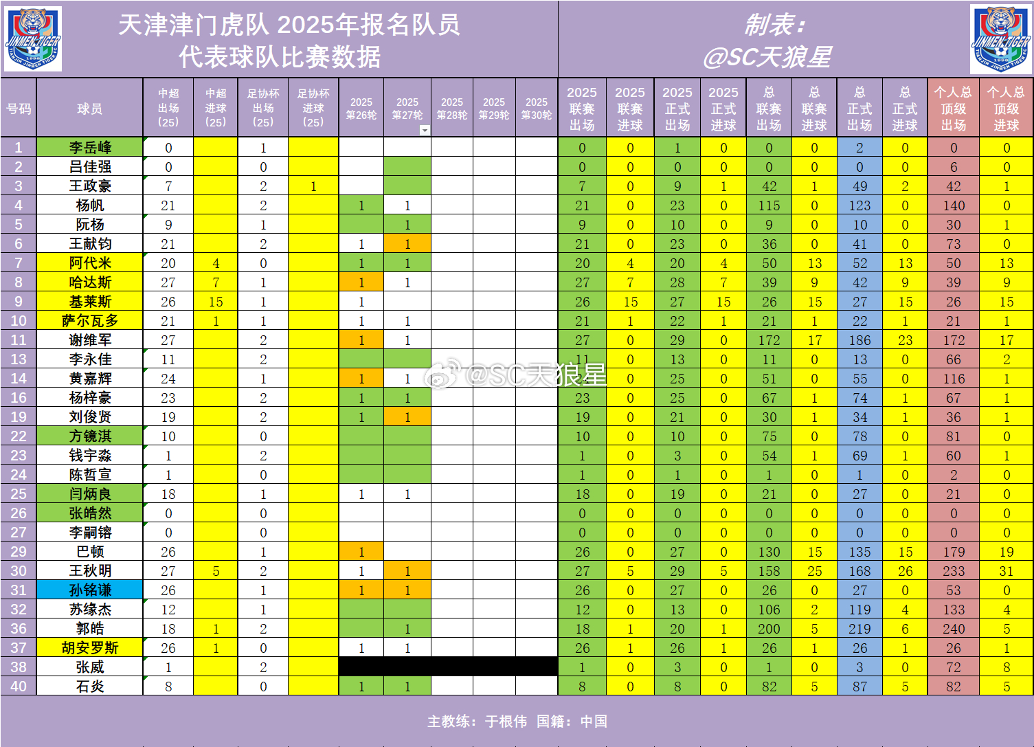 天津津门虎2025中超第27轮(0:2云南)赛后数据:1.闫炳良第一次代表