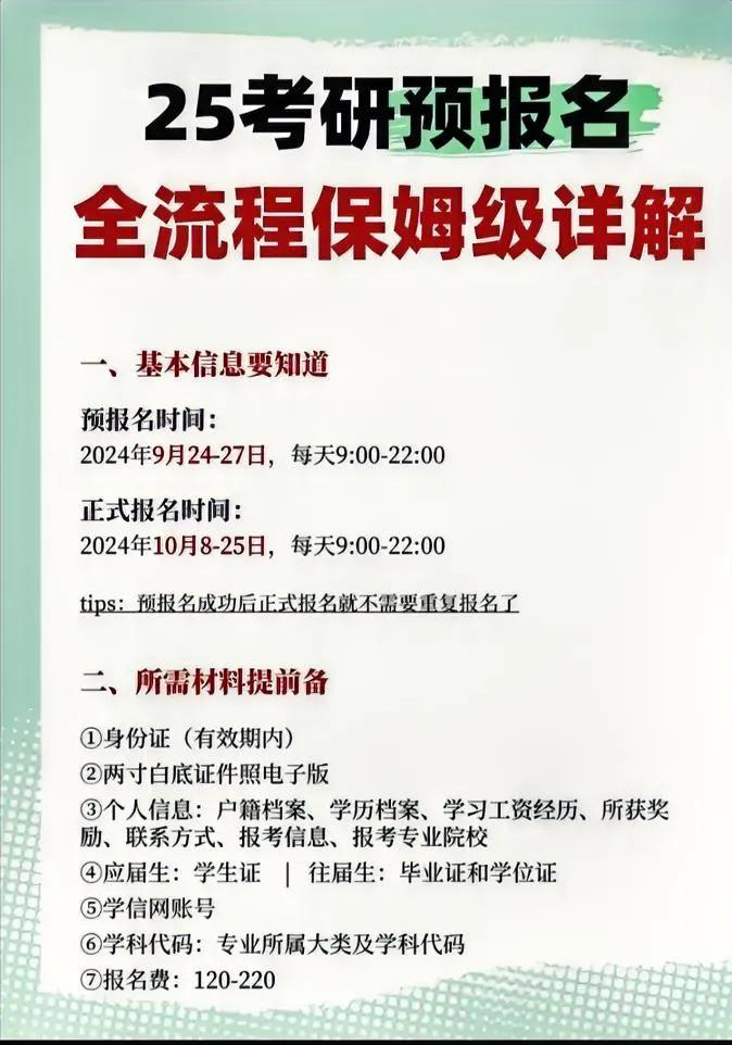 2026年考研预报名今日正式启动,广大考生是否已做好充分准备,迎接这场关键挑战? 本次预报名时间为2025年10月10日至13日,以及10月16日至27日。这一安排不仅让考生有机会提前熟悉报名流程,还能有效缓解正式报名期间的网络压力,避免因系统繁忙而影响报名。 考生需在此期间完成个人信息填报、缴纳报名费等关键步骤。一旦逾期,将无法修改或重新提交信息,因此务必高度重视。 预报名成功后,考生可在考前约10天登录研招网下载并打印准考证,这是参加初试和复试的重要凭证。 此外,各省级教育招生考试机构将陆续公布详细的报名安排,考生应密切关注官方通知,确保不错过任何重要时间节点。 顺利完成预报名,将为后续的正式报名和备考打下坚实基础,帮助考生以更从容的心态应对即将到来的研究生入学考试。2026年考研 考研时间安排