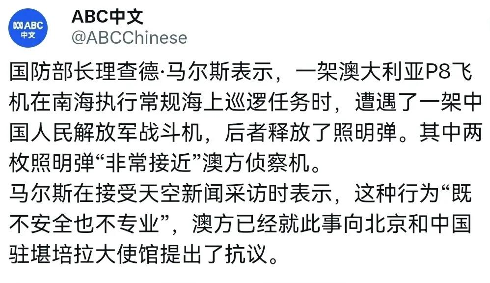 来自澳大利亚媒体10月20日消息说,澳大利亚国防部长马尔斯表示,在一架澳大利亚的P8飞机在南海巡逻期间,被解放军战机释放照明弹照射。 马尔斯强调,对此表示强烈抗议,因为这不安全,也不专业。 事实上,可以看出马尔斯这是不满了,急眼了,出来叫嚷来了。 只是,这种说法完全没有道理。澳大利亚飞机跑到我们这里要干什么呢?这是南海,不是澳大利亚的海域。既然跑来了,就不要担心不安全了。 而且,澳大利亚这样的情况已经不是一次两次了,每次都是这样,其用心可谓是路人皆知。 所以,对于马尔斯这种说法,就应该严厉谴责。